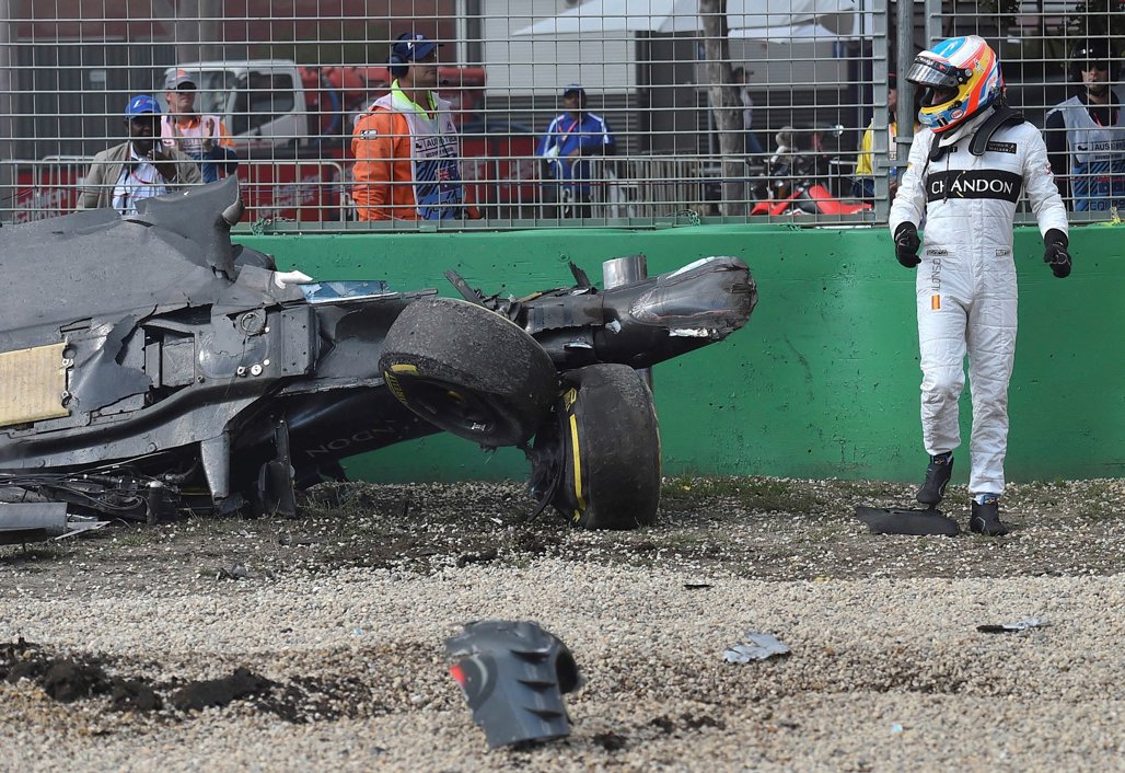 Alonso crawls unhurt from wreckage of his McLaren F1 car