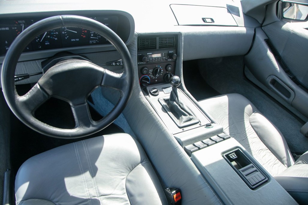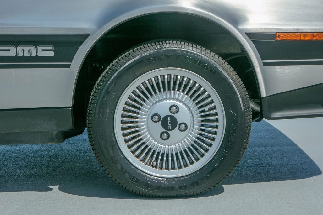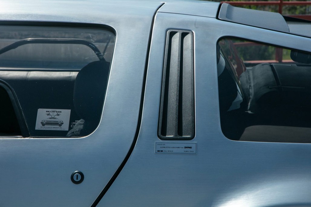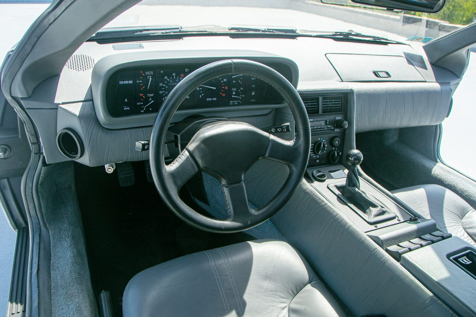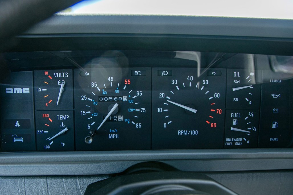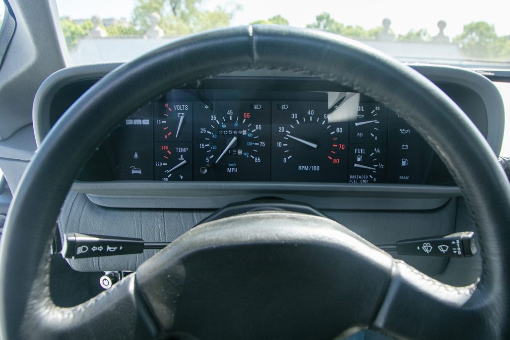 Like most of its kind, the DMC-12 features stock brushed aluminium panels and turbine wheels. On this car, this is matched inside to a grey leather interior.