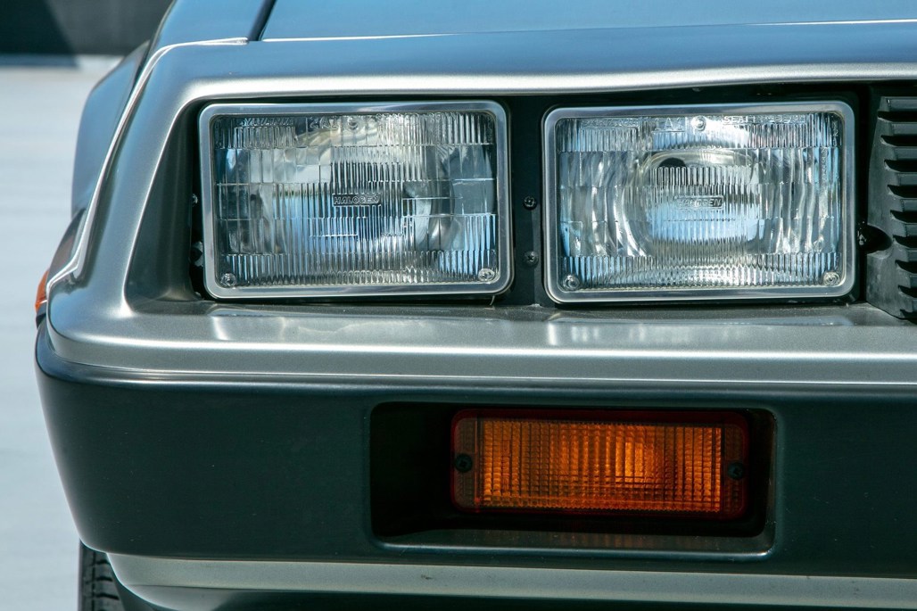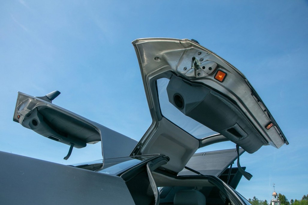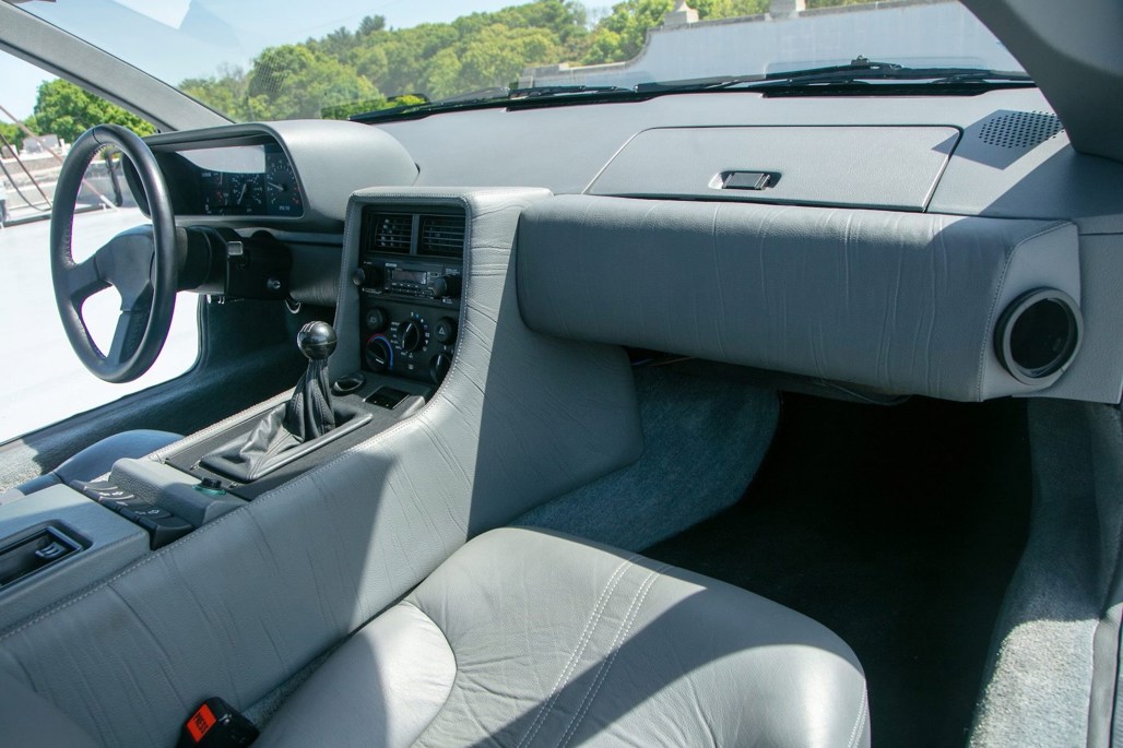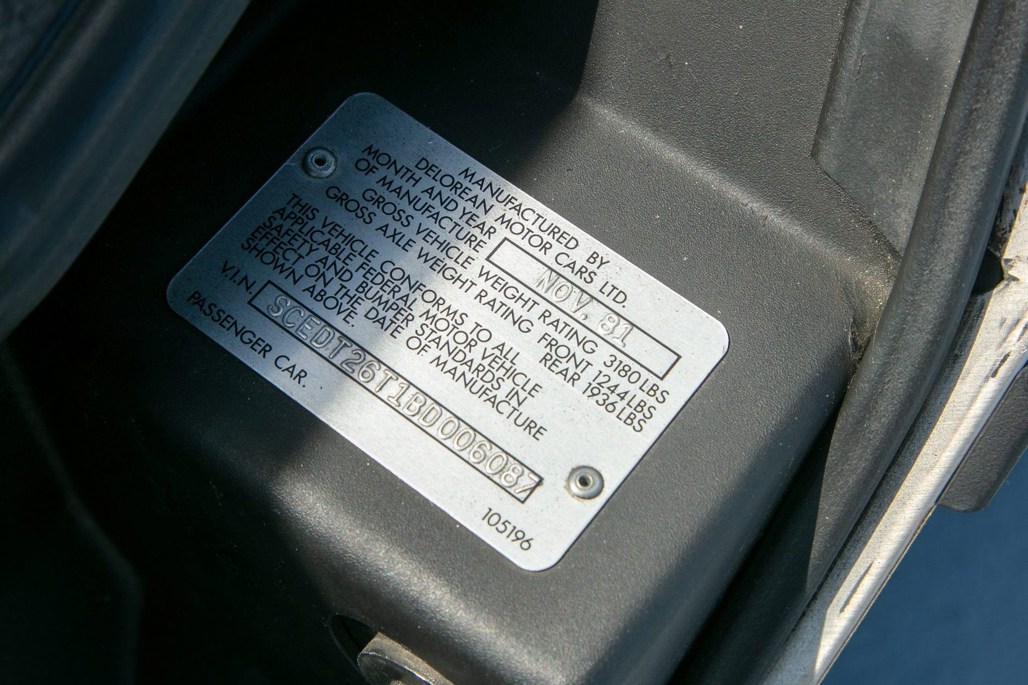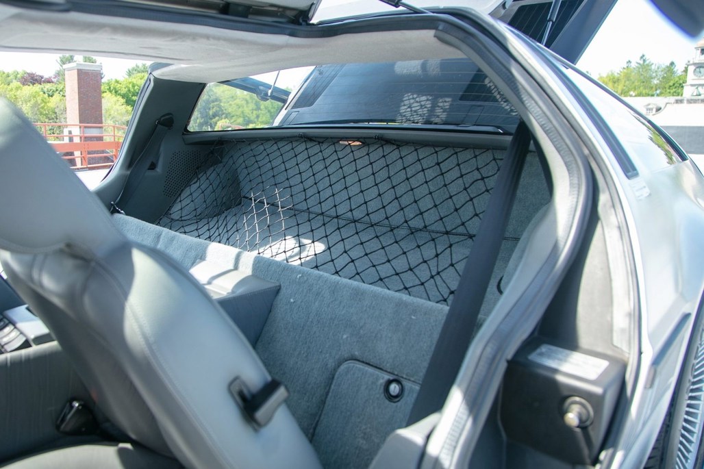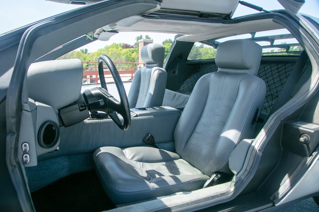 Like most of its kind, the DMC-12 features stock brushed aluminium panels and turbine wheels. On this car, this is matched inside to a grey leather interior.