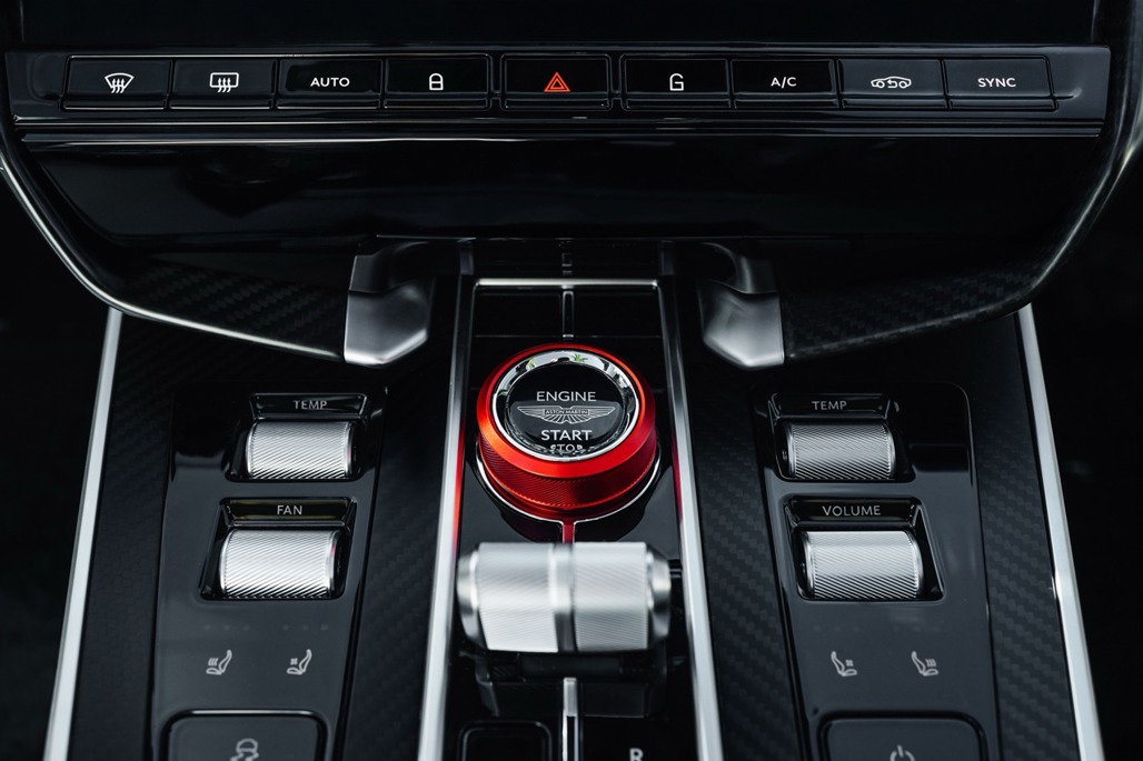 The rear carbon fibre crossbrace mirrors the exterior livery pinstripe, and a red anodised start/stop rotary provides a subtle interior accent.