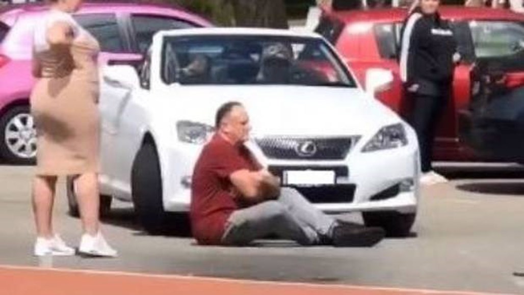 A man has been filmed sitting in front of a Lexus, in a fight in a car park that reportedly escalated after the car "nudged" him.