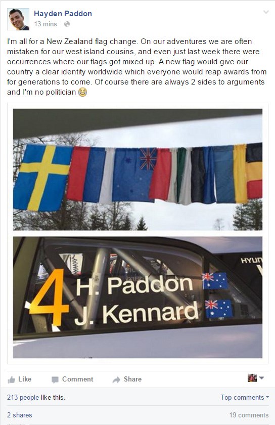 Most New Zealand sports stars, from what I’ve witnessed, have avoided it as well. But this morning, Kiwi World Rally driver Hayden Paddon waded into the fracas after having organizers and local sign writers mistake the Australian and New Zealand national flags during WRC Sweden — resulting in his i20 and local displays sporting the meat pie, Kangaroo, Fosters for everyone, Aussie flag. Stone the flaming crows.