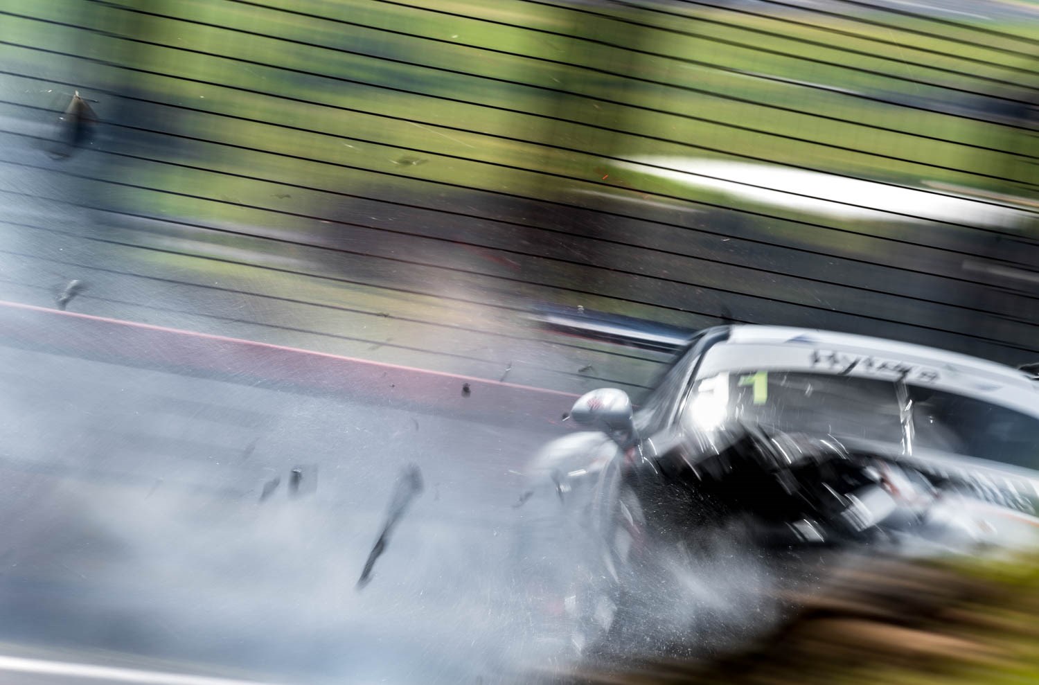 The thing about this ‘perfect shot’ that photographers crave, is that the biggest factor behind it isn't your standard of kit or the extent of your training. It's luck. Pure luck. And about two minutes prior to the crash, I'd altered my settings. So, instead of getting a clean and crisp photo of a Porsche suspended in mid-air, spewing fluids and carbon and mess all over the track — I got this.