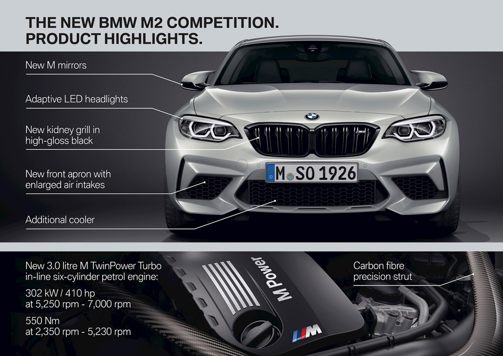 Headlining the new BMW M2 Competition is a new engine based on the power unit from the BMW M3 and BMW M4, providing a sharp increase in power over the outgoing 272kW M2.