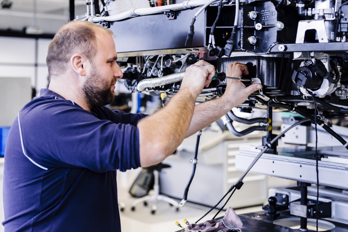 First, the powertrain is prepared for assembly. This arrives pre-assembled from the Volkswagen Group engine plant in Salzgitter, where specialists build the 1479 hp engine in a pilot hall equipped exclusively for Bugatti.
