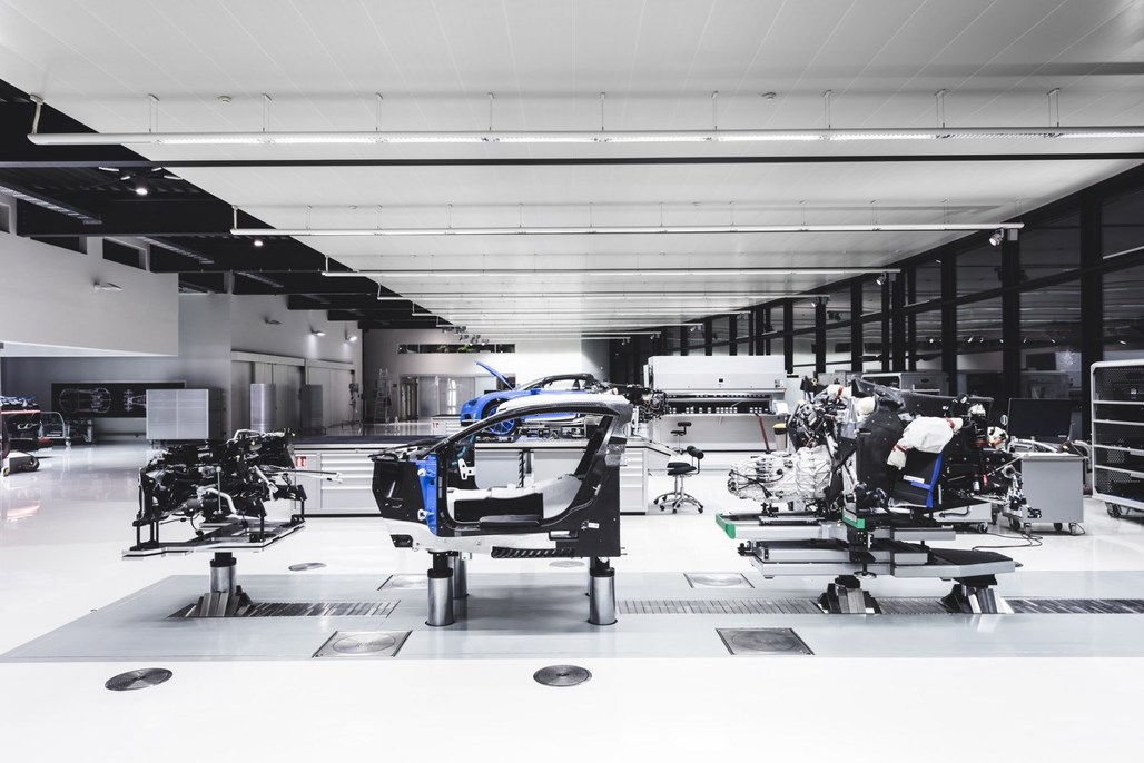At Bugatti no conveyor belts or robots will be found. People work at stations, as in the workshop of a Formula One team. All in all there are 12 stations.
