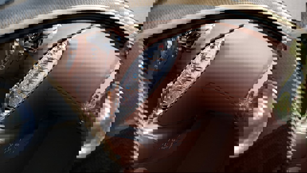 Inside, Bugatti calls it a near-total rethink versus recent W16 models, with a circular, Bauhaus-style steering wheel and a bespoke centre console and tunnel cover machined from solid aluminium blocks.