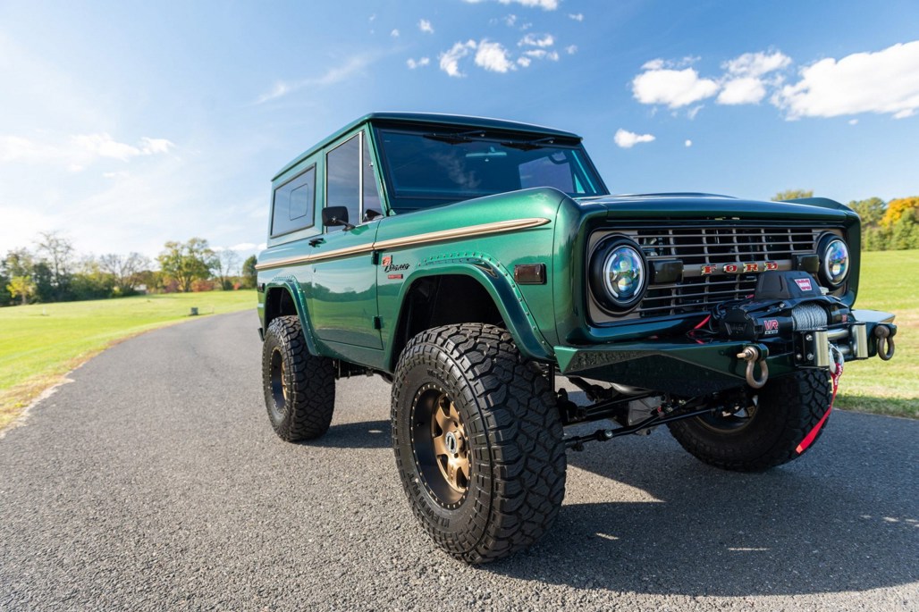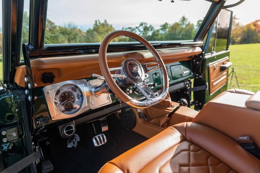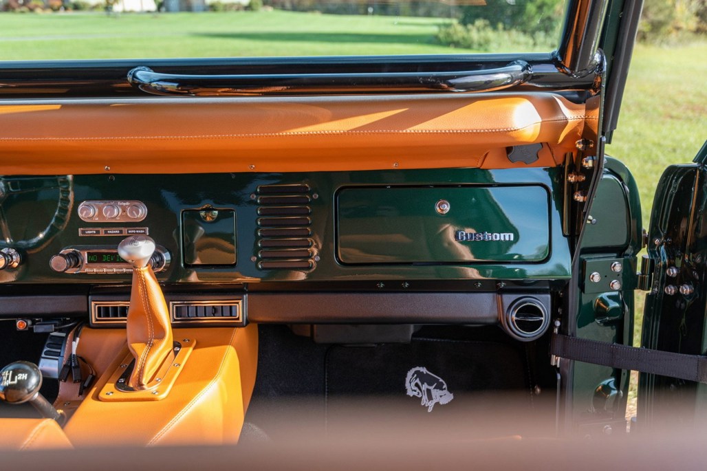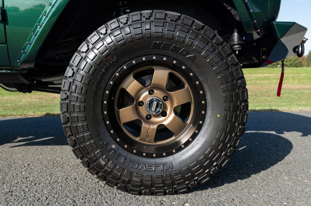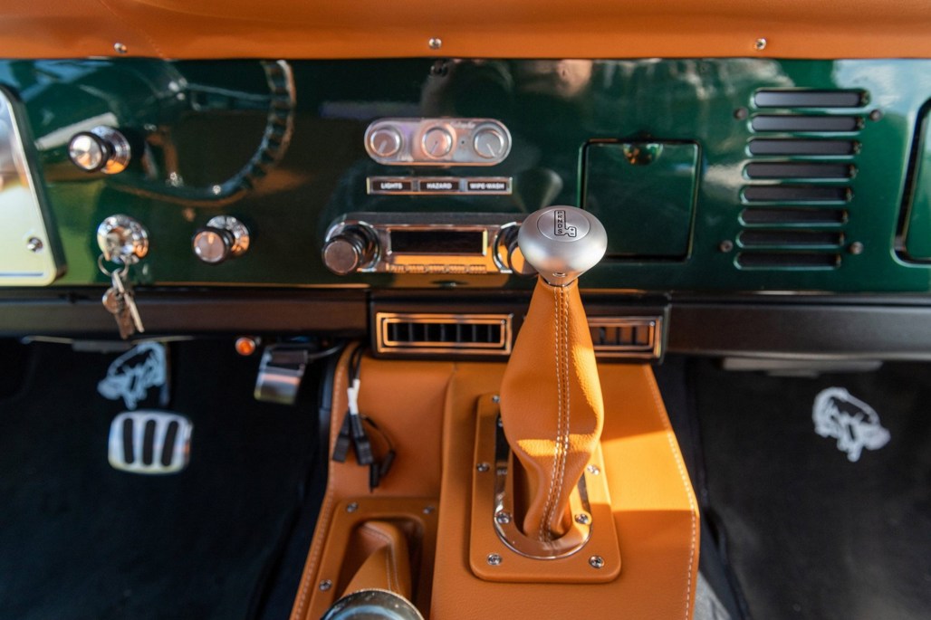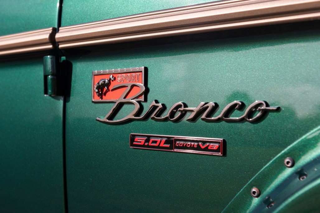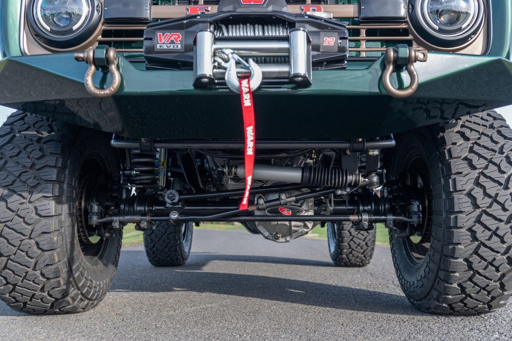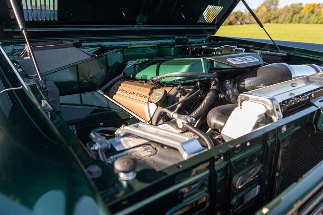 But what we all came here for, the engine holds the same 5.0-litre “Coyote” V8 found in modern Mustangs, sending its power to the rear or all four wheels through a 6-speed automatic transmission and a Dana 20 transfer case. The attention to detail is astounding, as even the cover is painted green to match the engine bay and exterior. Other mechanical upgrades include a new exhaust system, a 3.5″ suspension lift, new shocks, and new sway bars.
