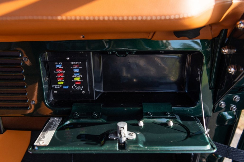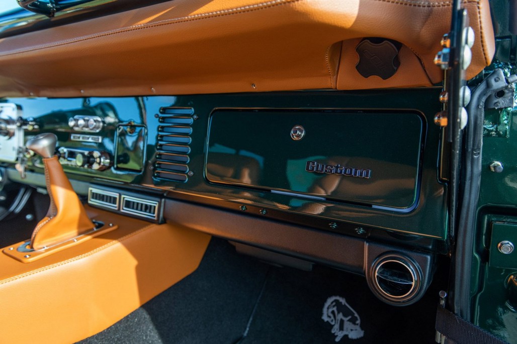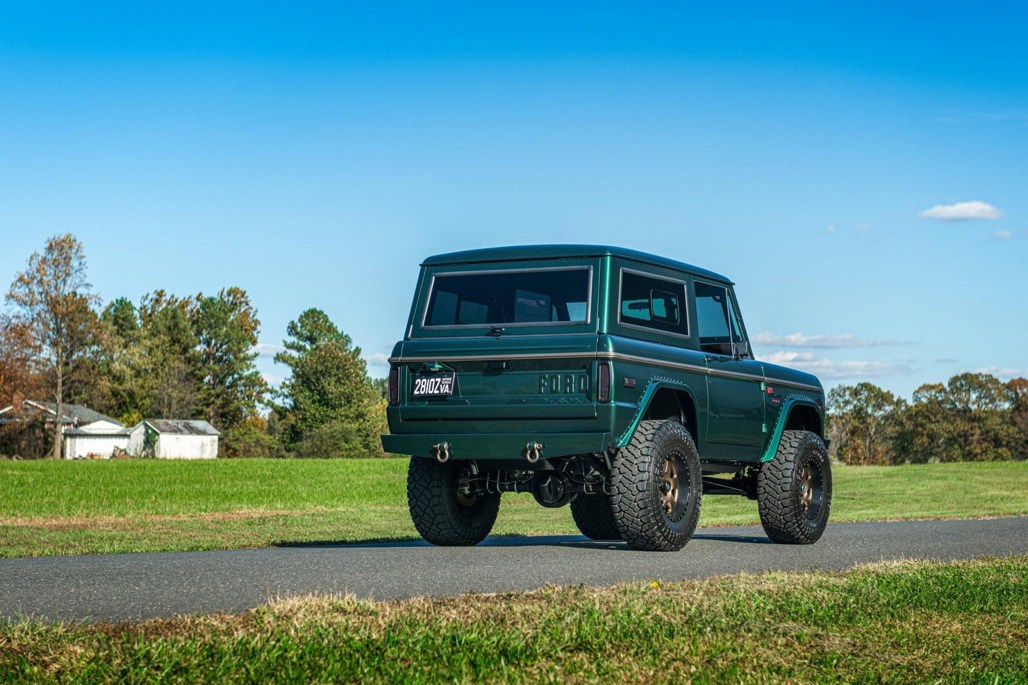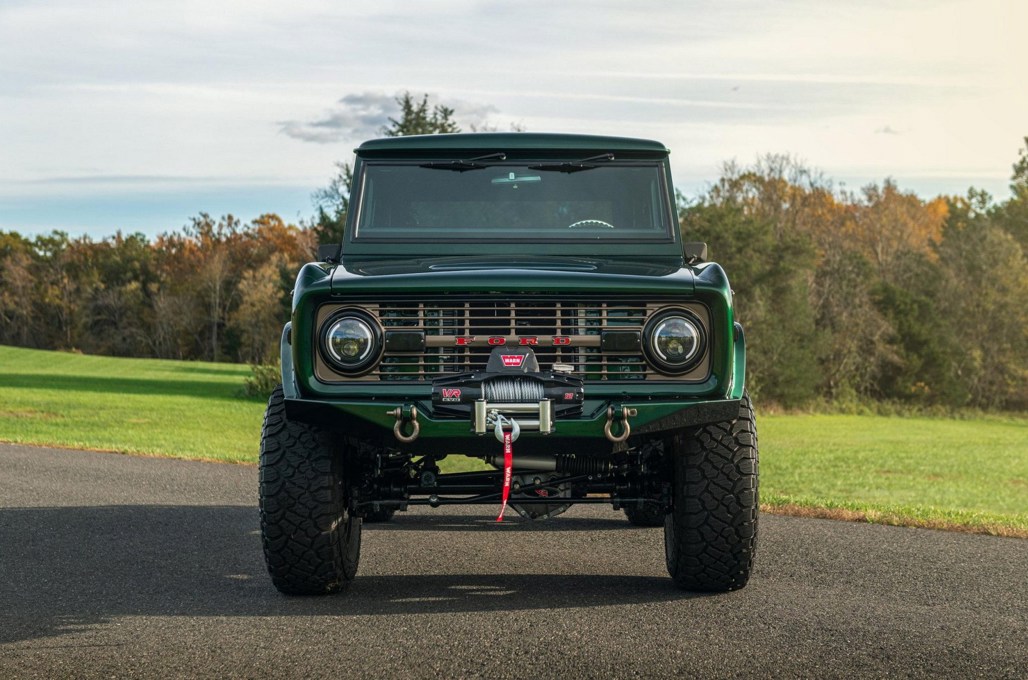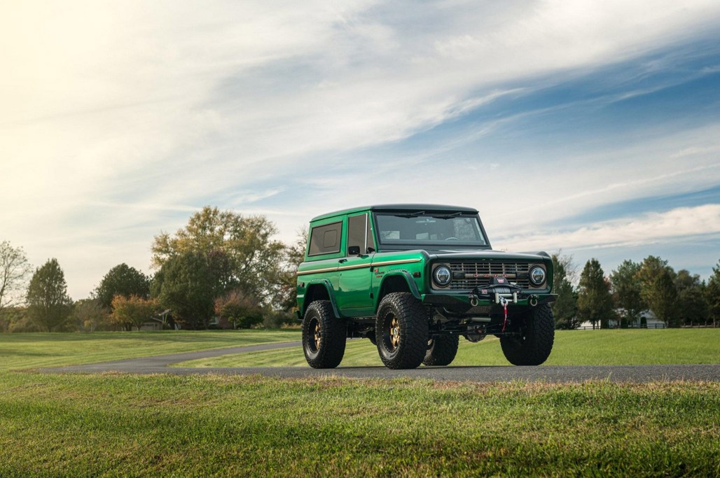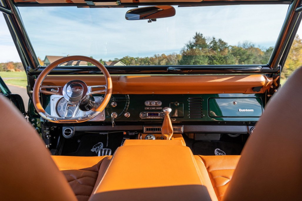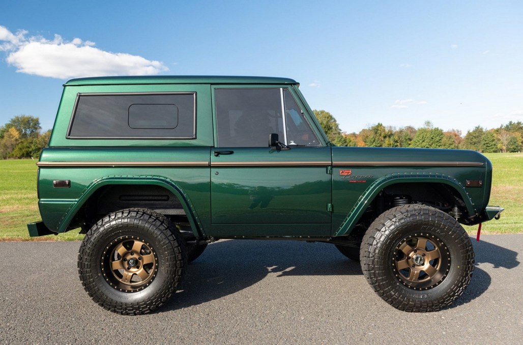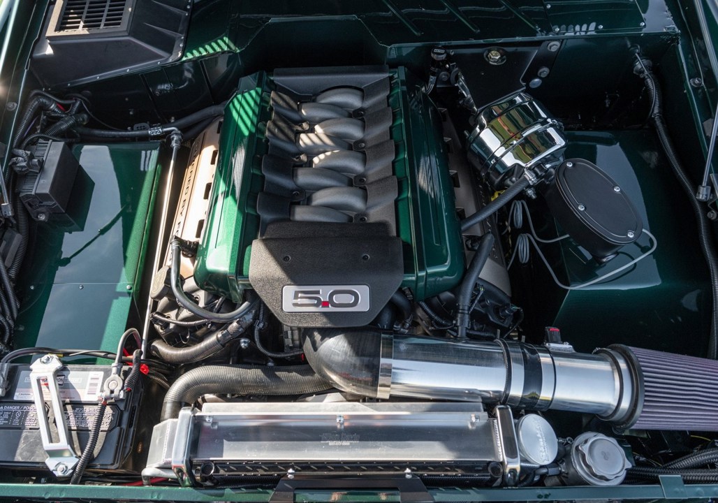 But what we all came here for, the engine holds the same 5.0-litre “Coyote” V8 found in modern Mustangs, sending its power to the rear or all four wheels through a 6-speed automatic transmission and a Dana 20 transfer case. The attention to detail is astounding, as even the cover is painted green to match the engine bay and exterior. Other mechanical upgrades include a new exhaust system, a 3.5″ suspension lift, new shocks, and new sway bars.