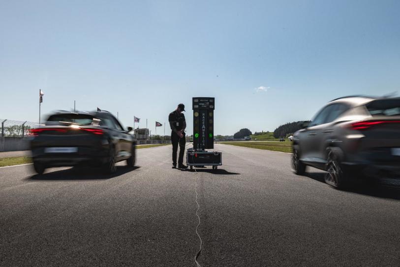 Things stepped up a bit at the drag racing with Formentor VZs and Leon Sportstourer VZs going head to head. While both the Leon wagon and Formentor share a 245kW/420Nm AWD powertrain, the Formentor weighs a tad more, clocking in at 1679kg against the Leon's 1651kg, but this really didn't matter given that while drag racing is ostensibly a competition of straight line speed, it is really a competition of reaction times...