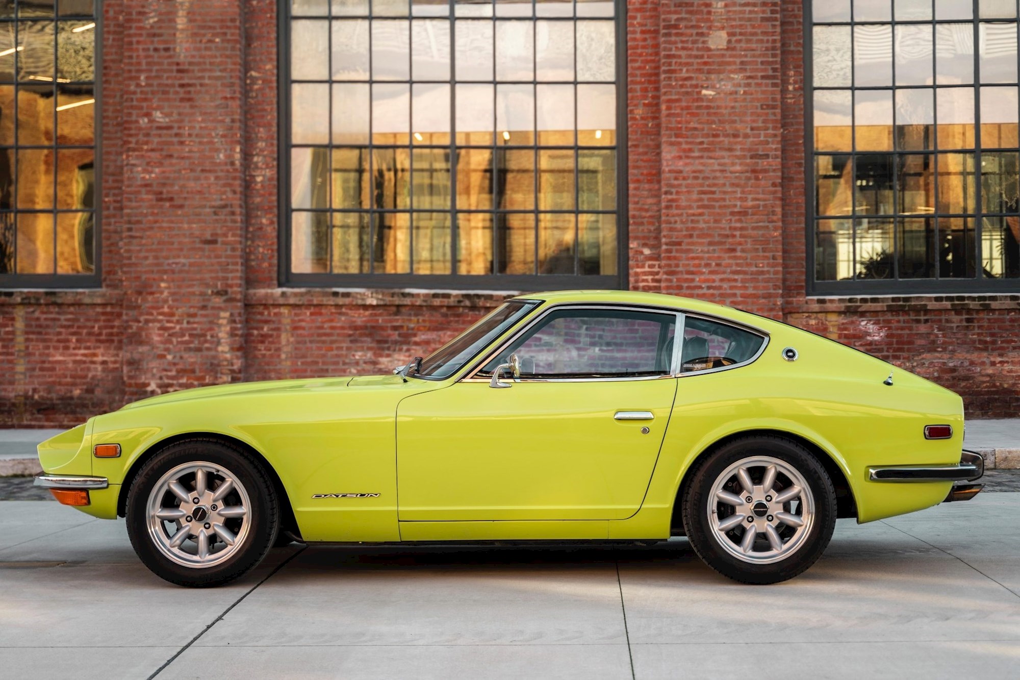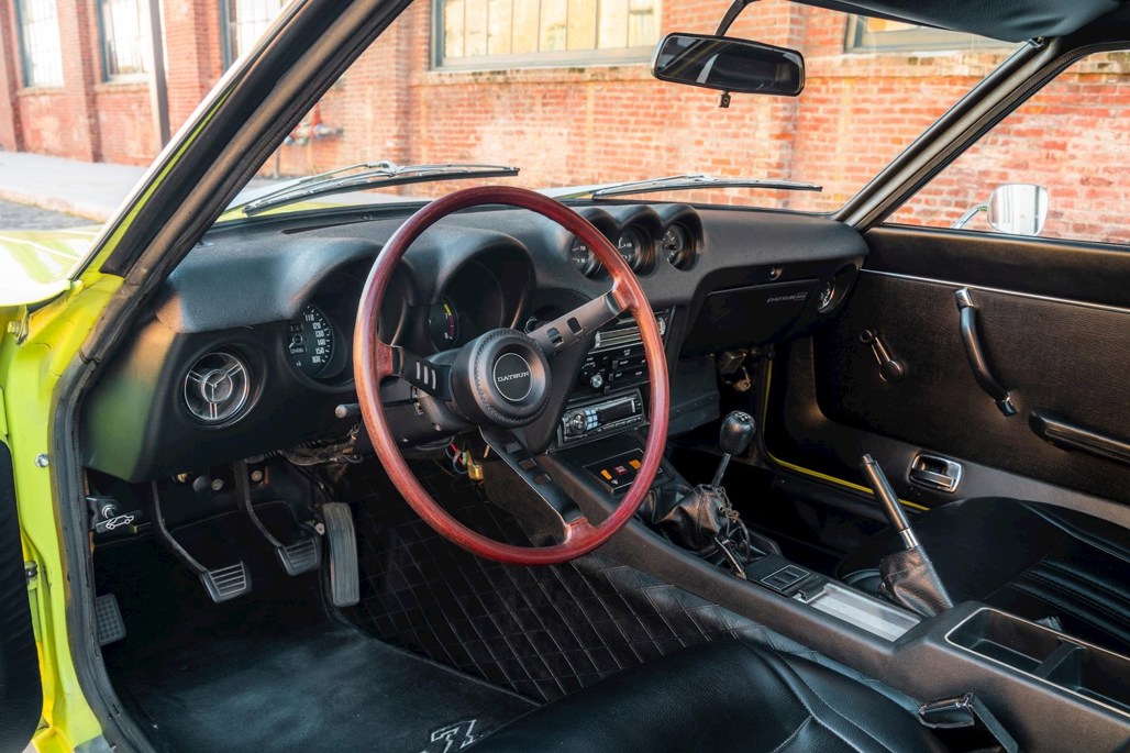 Repainted in Lime Yellow, the 240Z has been modified with a Rebello Racing 2.7-litre straight-six, triple Weber carbs and a five-speed manual transmission, as well as a limited-slip differential, four-wheel disc brakes, lowered suspension and 16-inch Panasport wheels.