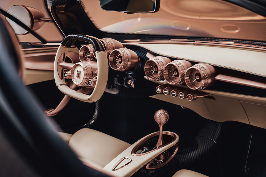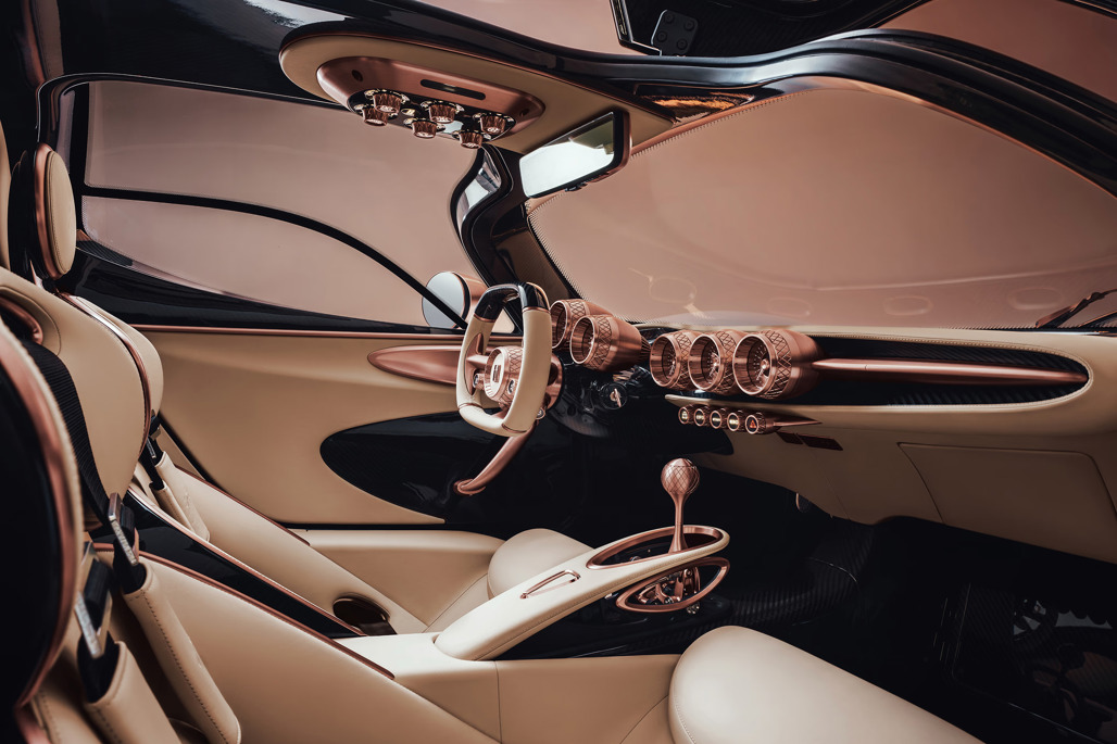 Instead, there’s hand-stitched white leather, exposed carbon fibre and rose gold-finished aluminium gauges, all arranged with obsessive attention to tactile beauty. Even the exposed shifter gets the rose gold treatment.