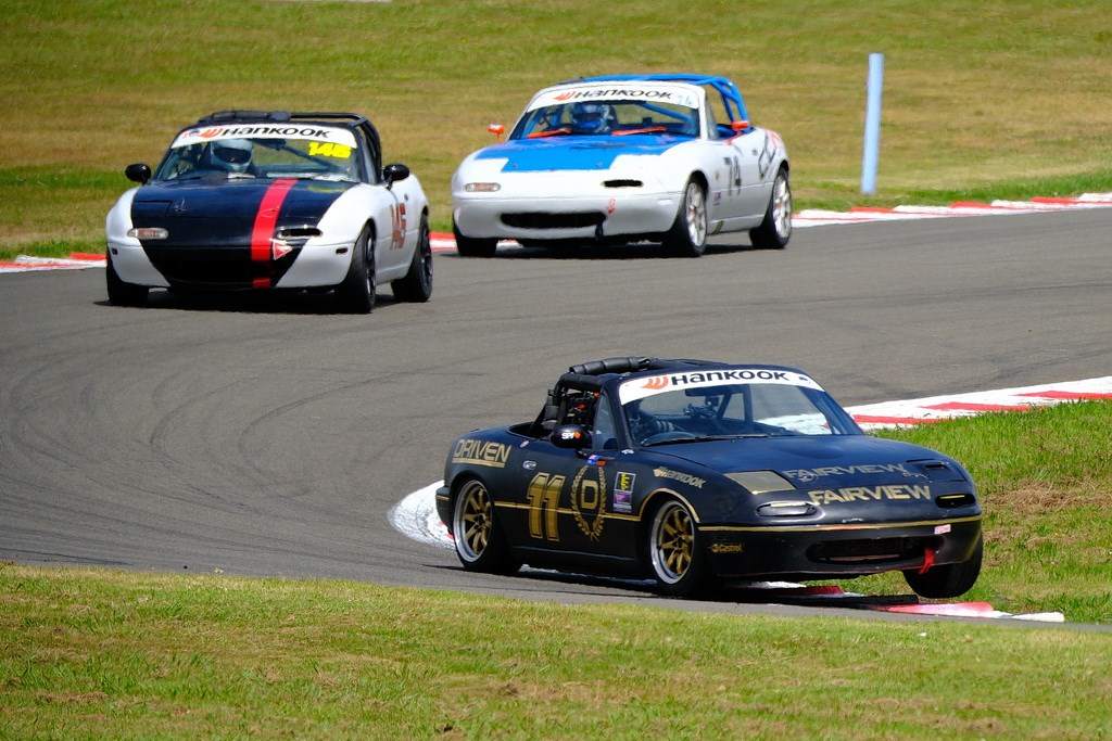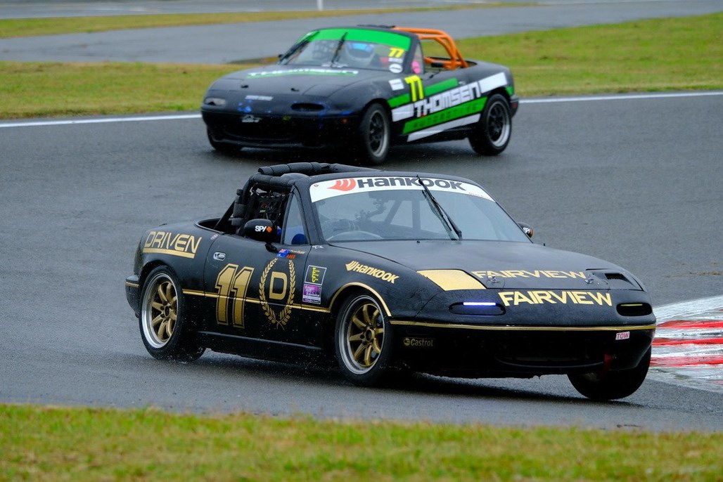For the DRIVEN MX-5 it was lonely for six laps, trying to avoid missed 2-3 shifts, before Oliver Sapsford closed in for the last two. Needing a defensive line, he made one attempt that we fought off, then on the second-last corner of the last lap, he made a big dive around the outside of the third-gear Higgins corner, but hit the marbles and slid off the track, offering the Fairview/DRIVEN MX-5 some breathing space to cruise to the chequered flag for the final podium spot, live-on-TV post-race interview with Stephen McIvor, podium presentation, trophy and champagne!