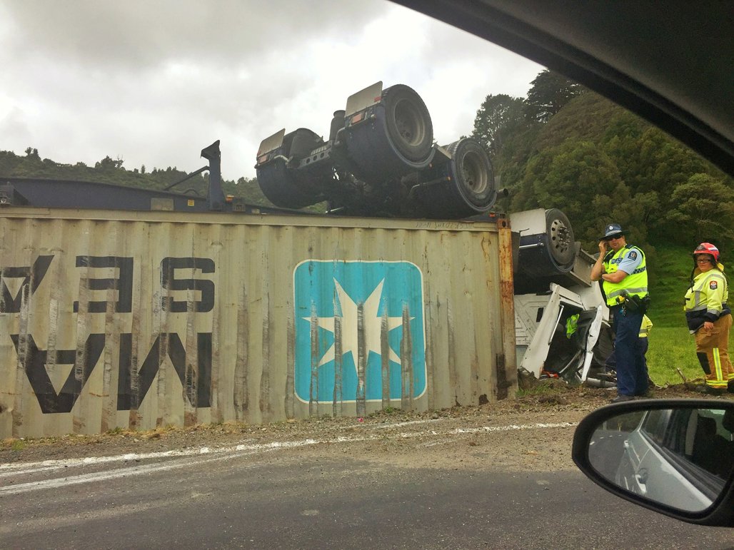 The driver suffered minor head injuries, but a crane was needed to help overturn the heavy crane his truck had been carrying, a police media spokeswoman said.