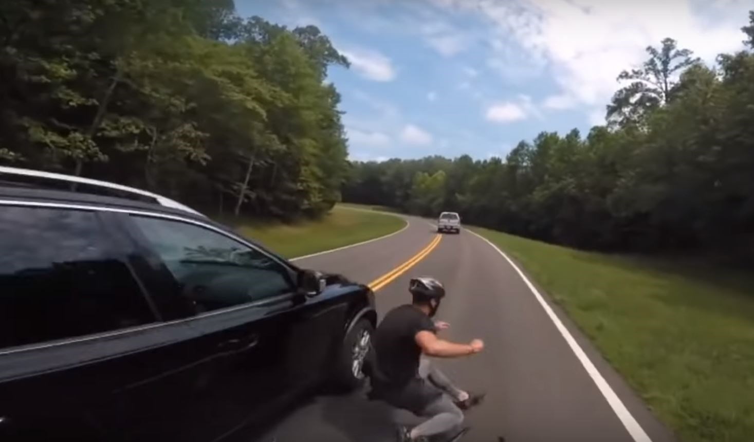 Miraculously, the rider escaped this incident without serious injury, but watched the black SUV speed off down the road. Any more force from the vehicle could've left the cyclist with serious injuries or worse.