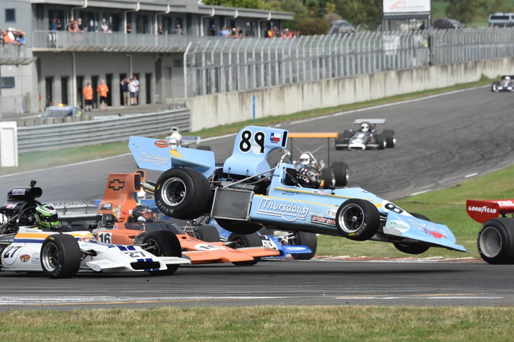 A first corner touch with Michael Collins (Christchurch) on Saturday launched the March high in the air but the car landed on its wheels and Thornton was able to limp back to the pits. He posted a fifth place in race one and was involved in an early battle with series leader Collins for third spot in the feature race when the screaming V6 expired.