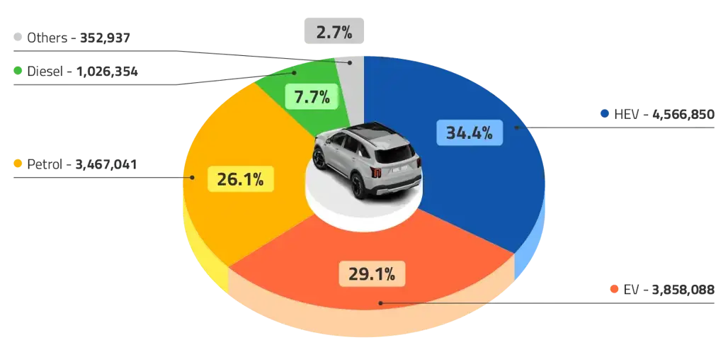 Despite the high profile of fully electric cars, hybrid electric vehicles (HEVs) actually claimed the largest slice of the European market in 2025. With 4.57 million units sold, hybrids captured 34.4 percent of the market, officially outpacing the combined sales of traditional petrol and diesel vehicles.