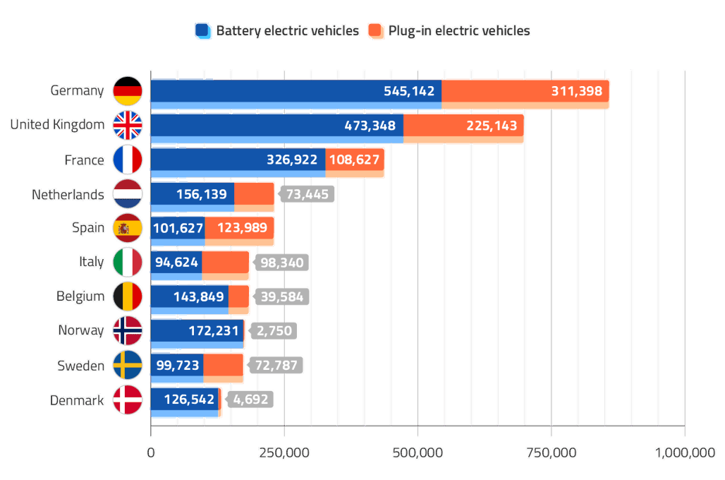 According to a new report from financial analysis platform TradingPedia, Germany continues to be the largest EV market in absolute terms, with German consumers buying 856,540 electric vehicles in 2025, representing a nearly 50 percent increase from the previous year. This growth occurred despite the end of certain government subsidies, which led some buyers to hedge their bets by opting for plug-in hybrids (PHEVs) alongside fully electric models.