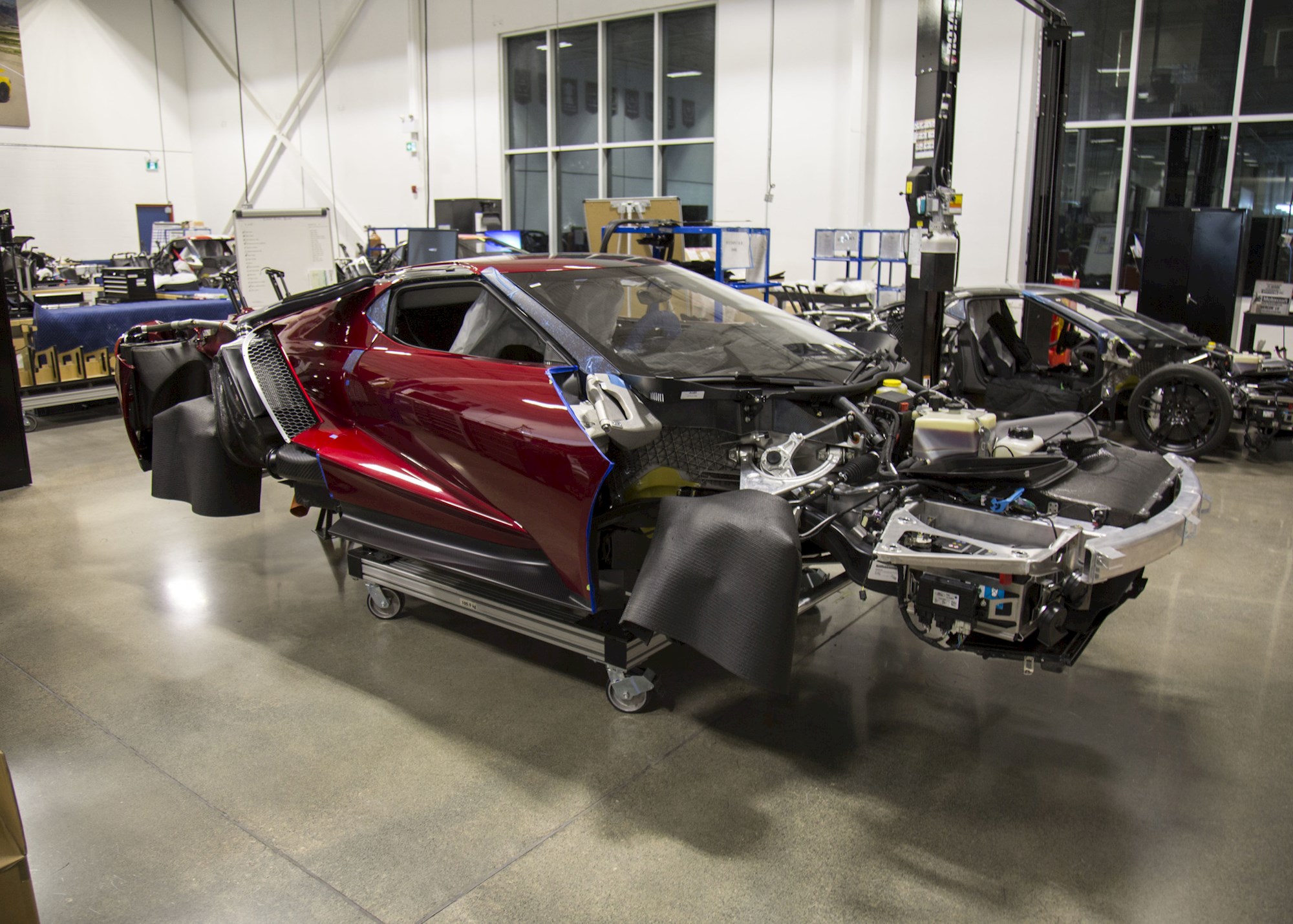 The GT has a lightweight carbon fibre monocoque bolted to aluminium front and rear subframes covered in carbon fibre body panels. The car also has racing-inspired pushrod suspension, active aerodynamics, and dihedral doors. The windshield of the vehicle is made of Gorilla Glass, which is used for smartphone screens, to reduce the weight of the vehicle.