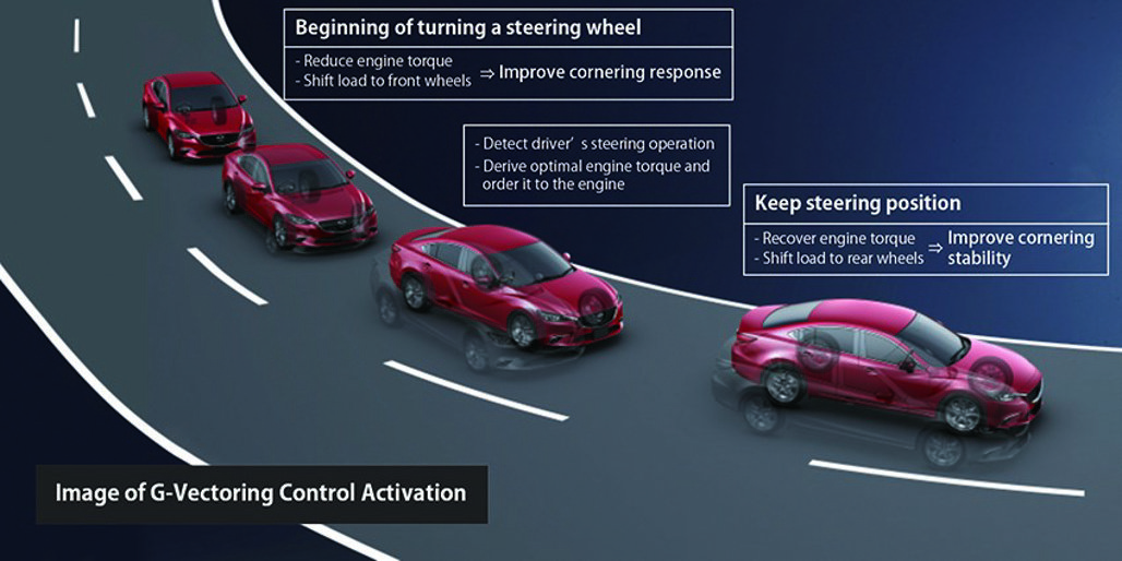 Now GVC equipped Mazda vehicles (firstly updated Mazda3 and Mazda6 models) can automatically make a small reduction in engine torque in response to a steering input, placing a slightly increased load on the front tyres and providing that enhanced turn-in response that increases the connected feel that a driver has with the car.
