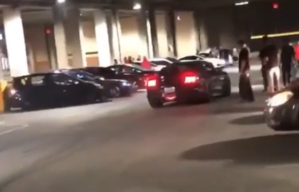 In a clip that's gone viral, a Mustang driver decides to do what appears as a half-hearted burnout inside a carpark building.