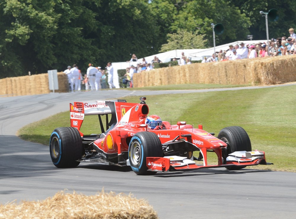 Ferrari test driver Marc Gene steers a 2010 vintage Ferrari F10 Formula 1 racer between the straw bales at Goodwood. Picture/Colin Smith.