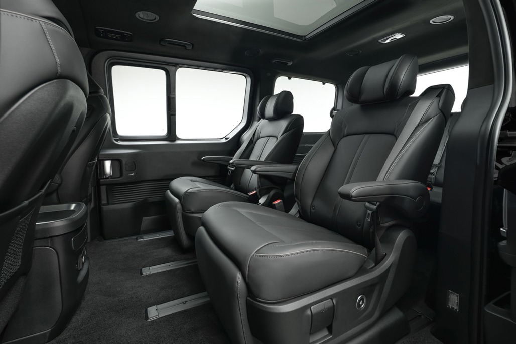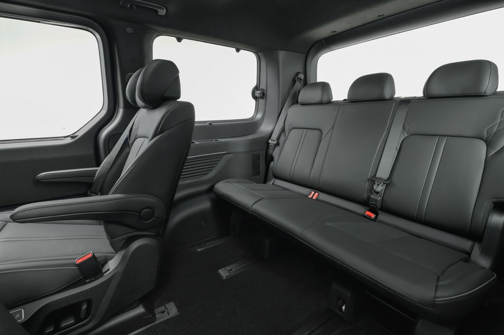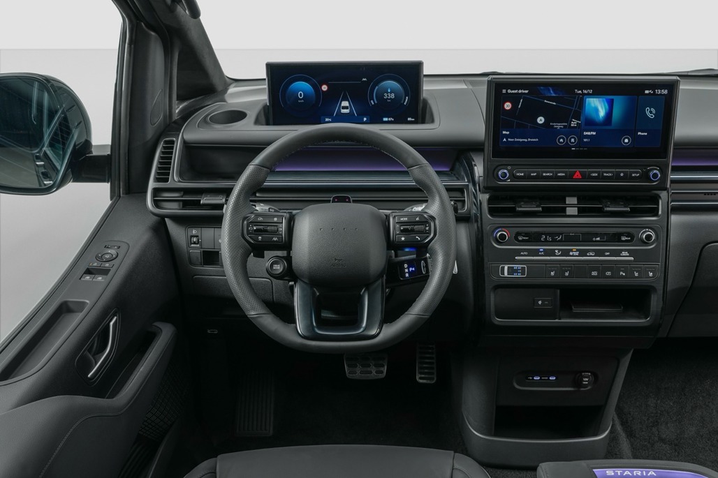 Design-wise, Staria Electric keeps the model’s one-curve silhouette but swaps in EV-specific details, including a closed-off front for aero gains and a continuous horizontal light band.