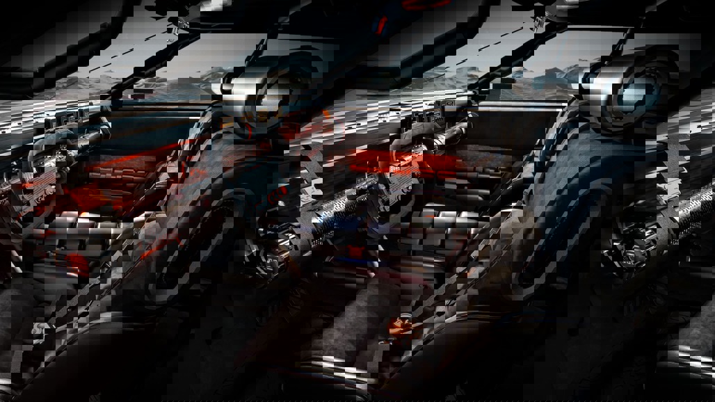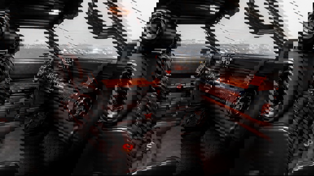 Think crash-pad ambient glow filtering through perforated metal, wraparound seats with four-point harnesses and a visible roll cage that doubles as both structure and statement.