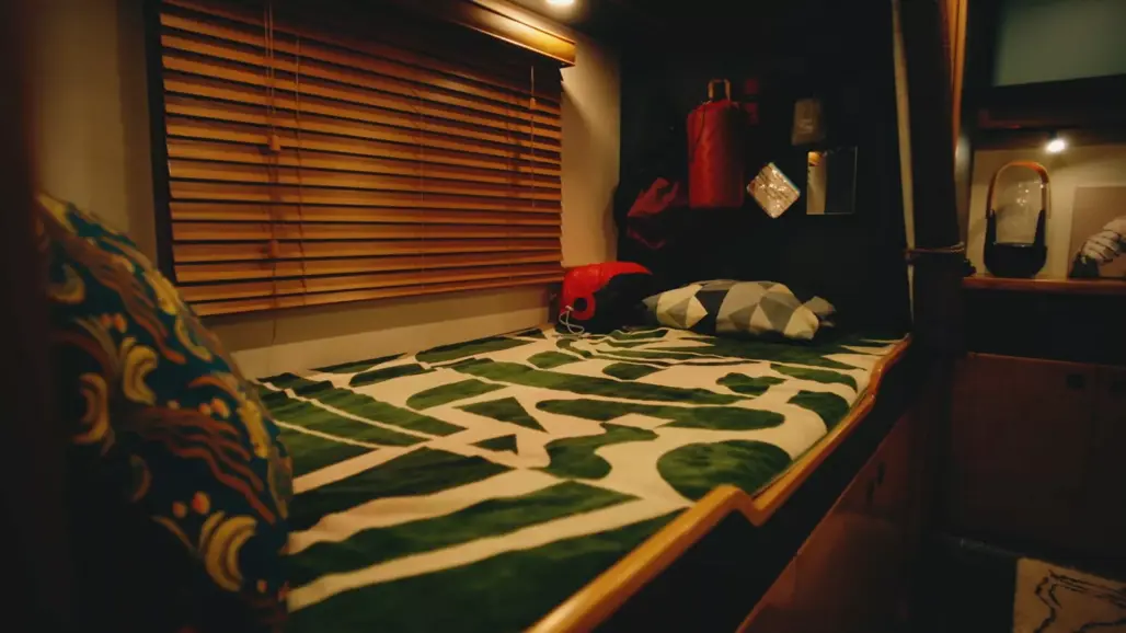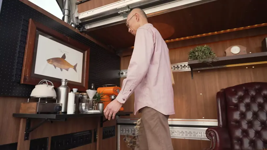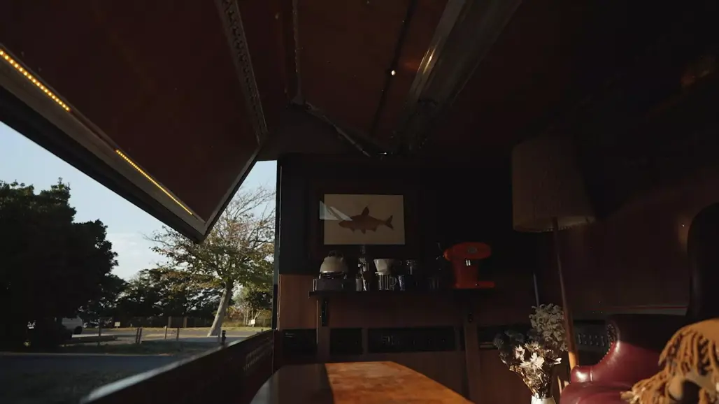 A large gullwing door and drop-down side panel lift to reveal a compact living space that feels more boutique studio than box truck.