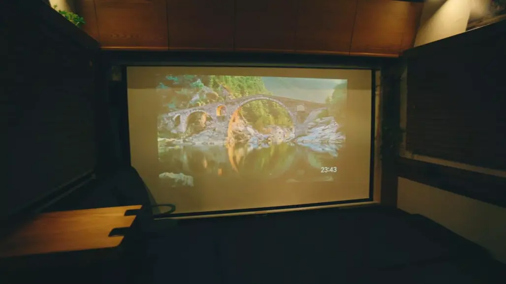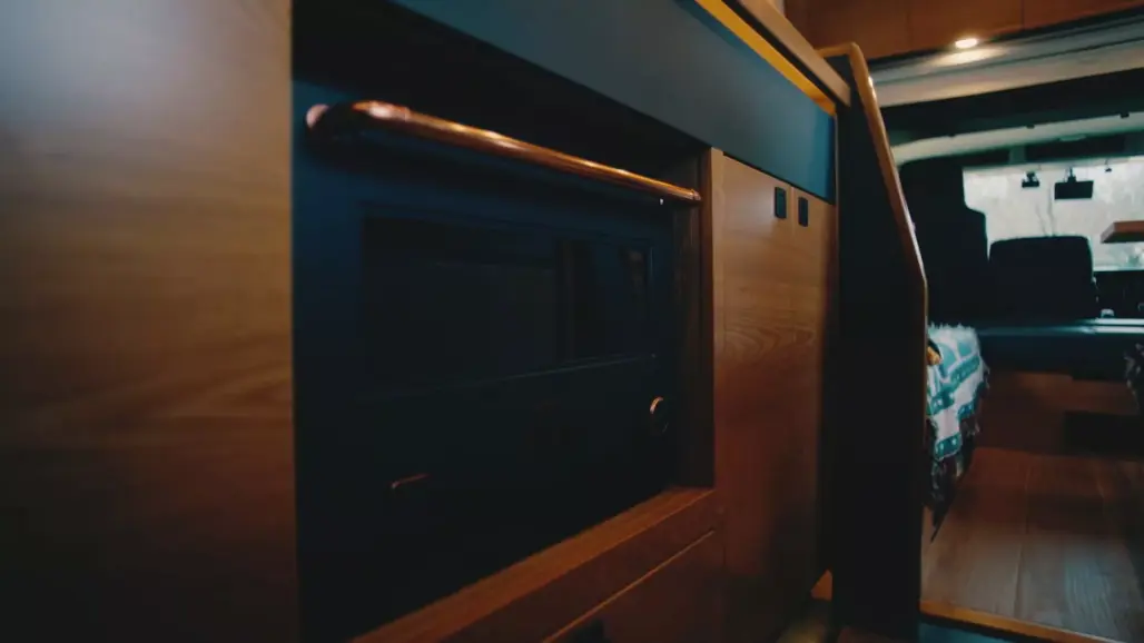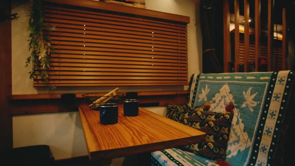 Inside, the atmosphere shifts to warm wood finishes and apartment-style comfort. There’s a dining area, full kitchen, convertible sofa bed and a separate rear bedroom, complete with a projector.
