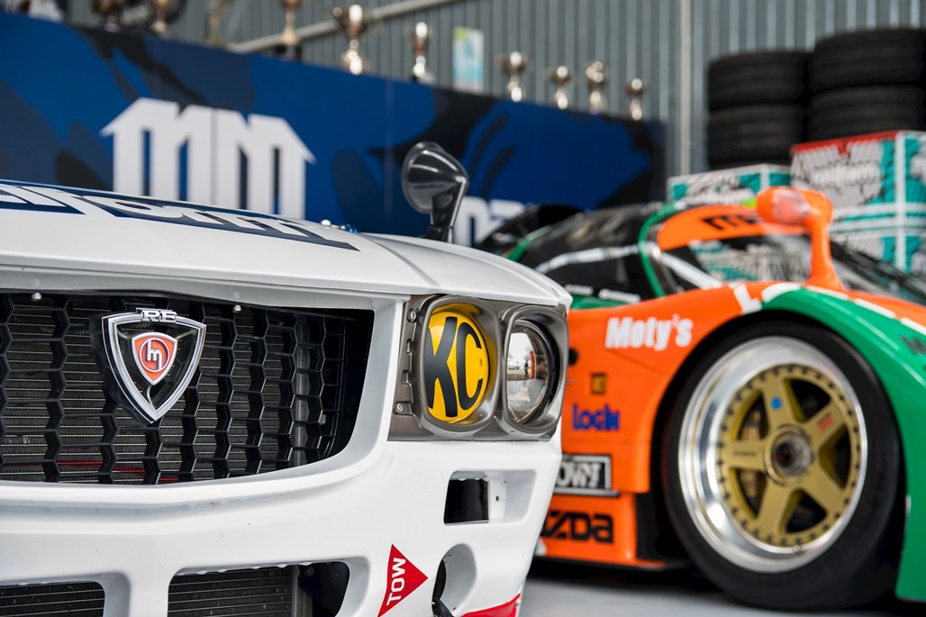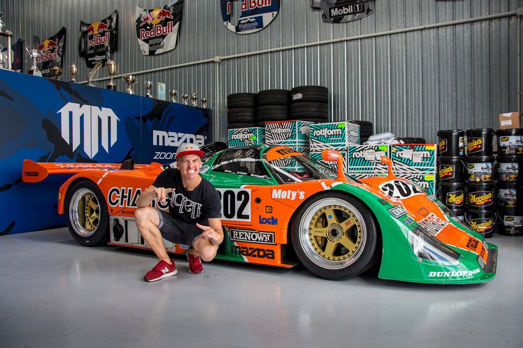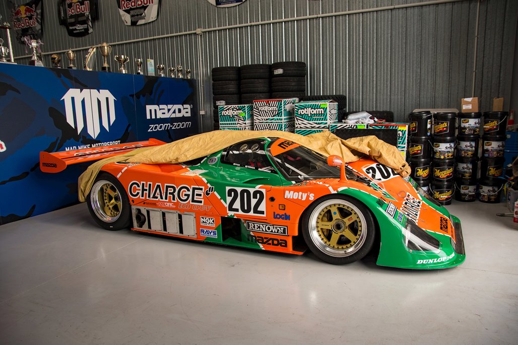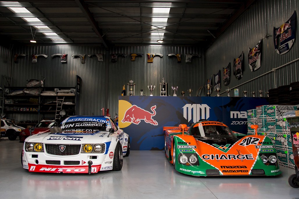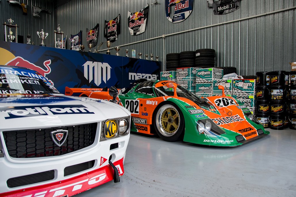 We're sitting in his office, surrounded by Mazda and Red Bull paraphernalia. On the opposite side of the wall behind us, a bright orange and green 'exception' to the reliability rule — a Mazda 767B. Fresh off the boat for its Kiwi debut at Mad Mike's Summer Bash in Hampton Downs this weekend.