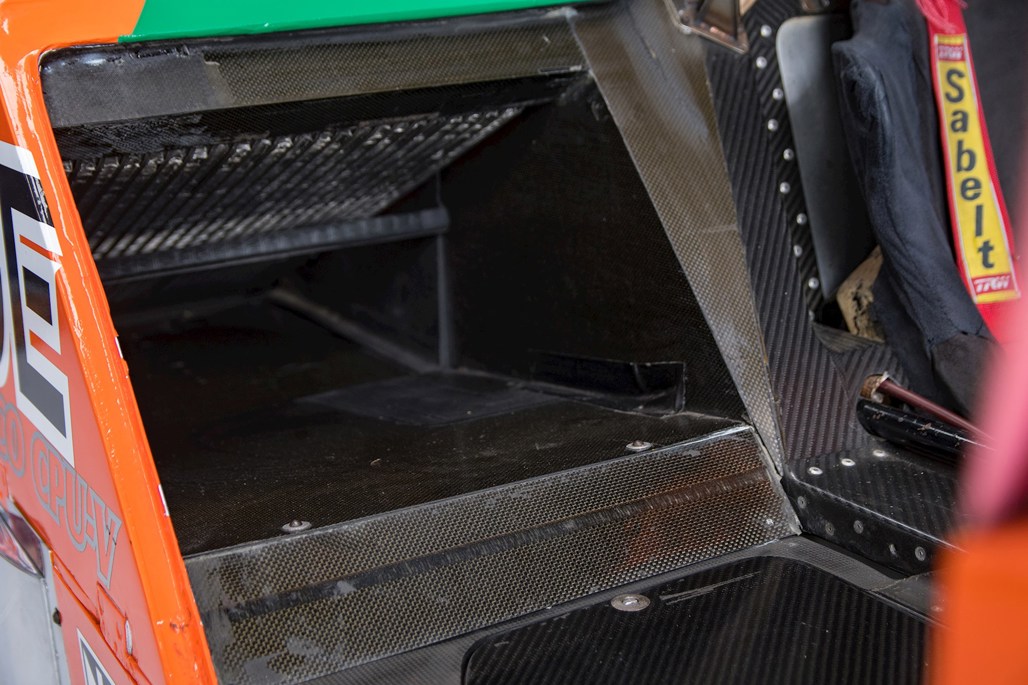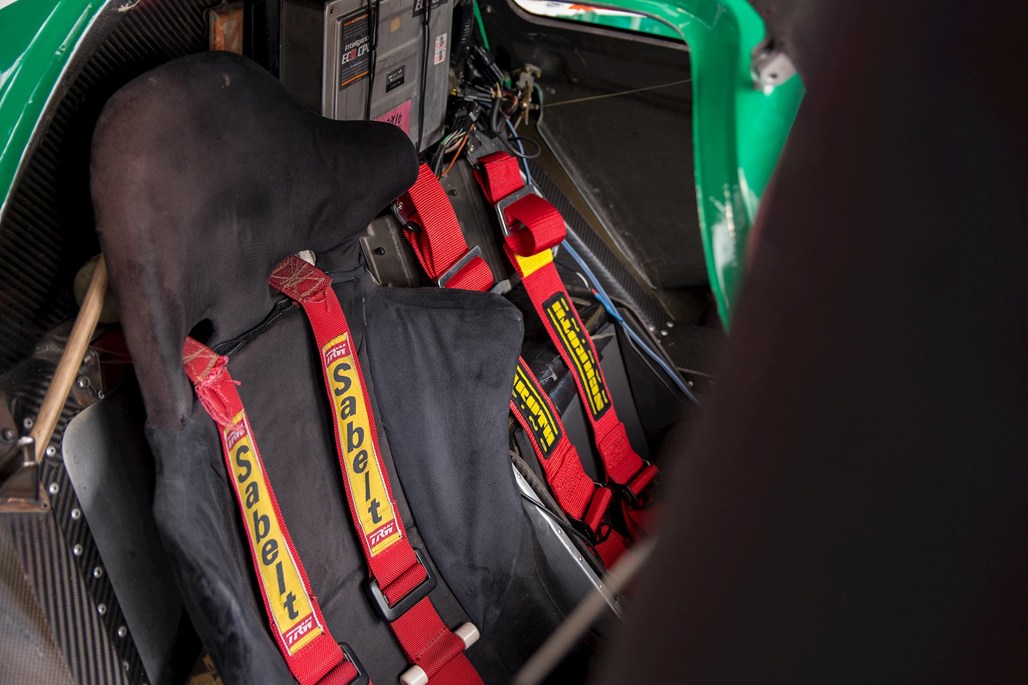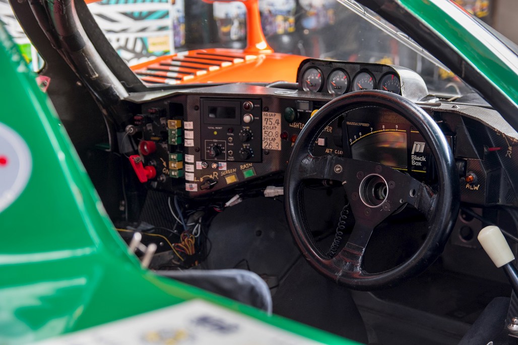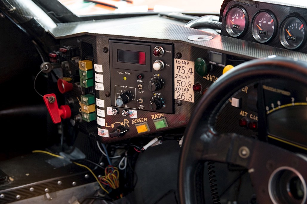 The cabin is mostly spartan, apart from a tangle of multi-coloured wires and a raft of hand-written notes on the dashboard. Some notes detail what buttons do, others appear to reference fuel level in 10-lap intervals for the driver.
