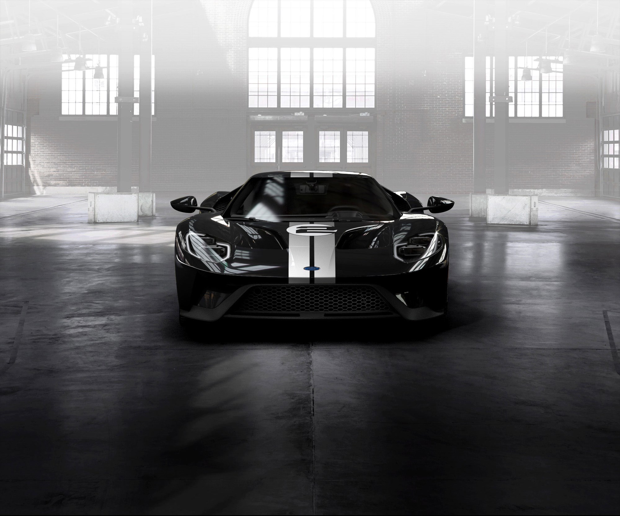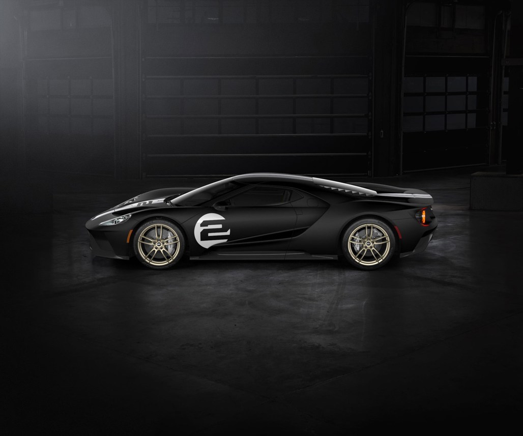 The Ford GT ’66 Heritage Edition features a Shadow Black exterior in either gloss or matte finish with silver stripes and exposed carbon fiber package. The car sports Frozen White #2 hood and door graphics, and 20-inch one-piece forged aluminum wheels in a gold satin clearcoat with black lug nuts.