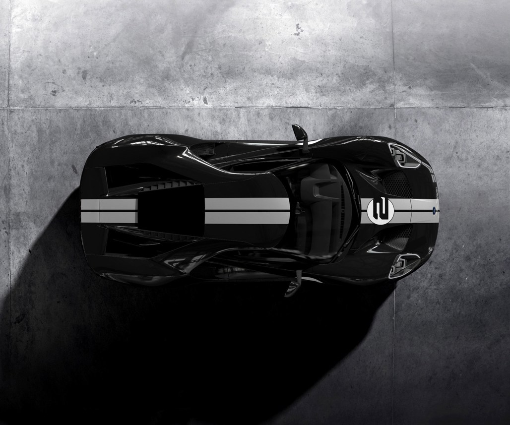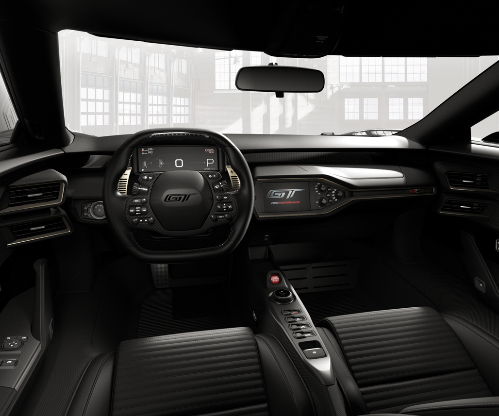 The interior of the limited edition model wraps the Ford GT carbon-fiber seats in Ebony leather, with pillowed inserts and plow-through stitching, and the seats’ head restraints and the steering wheel are debossed with the Ford GT logo. The instrument panel, pillars and headliner also features an Ebony-leather wrap, with gold appliqués on the instrument panel, the seat’s X-brace and shift paddles. Like the 1966 race car, the steering wheel is leather wrapped, with seat belts featuring a unique blue webbing.
