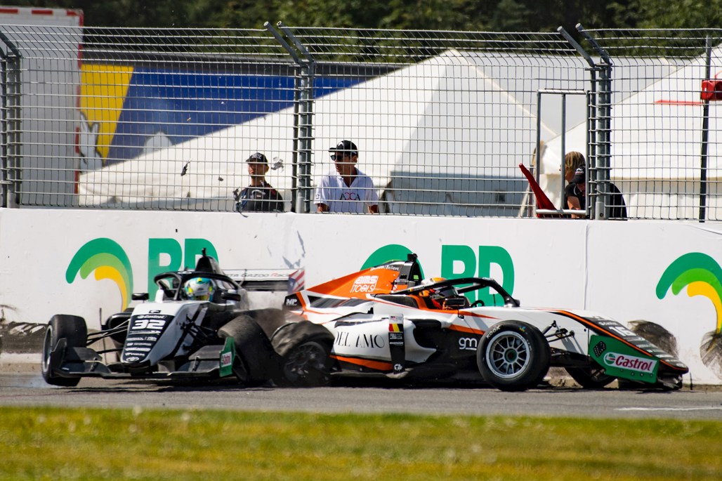 The session was cut short when Amaury Cordeel (Belgium) crashed into the wall at the sweeping final corner. He was then collected by Kiwi Motorsport teammate José Blanco (Puerto Rico) at high speed [pictured in lead].
