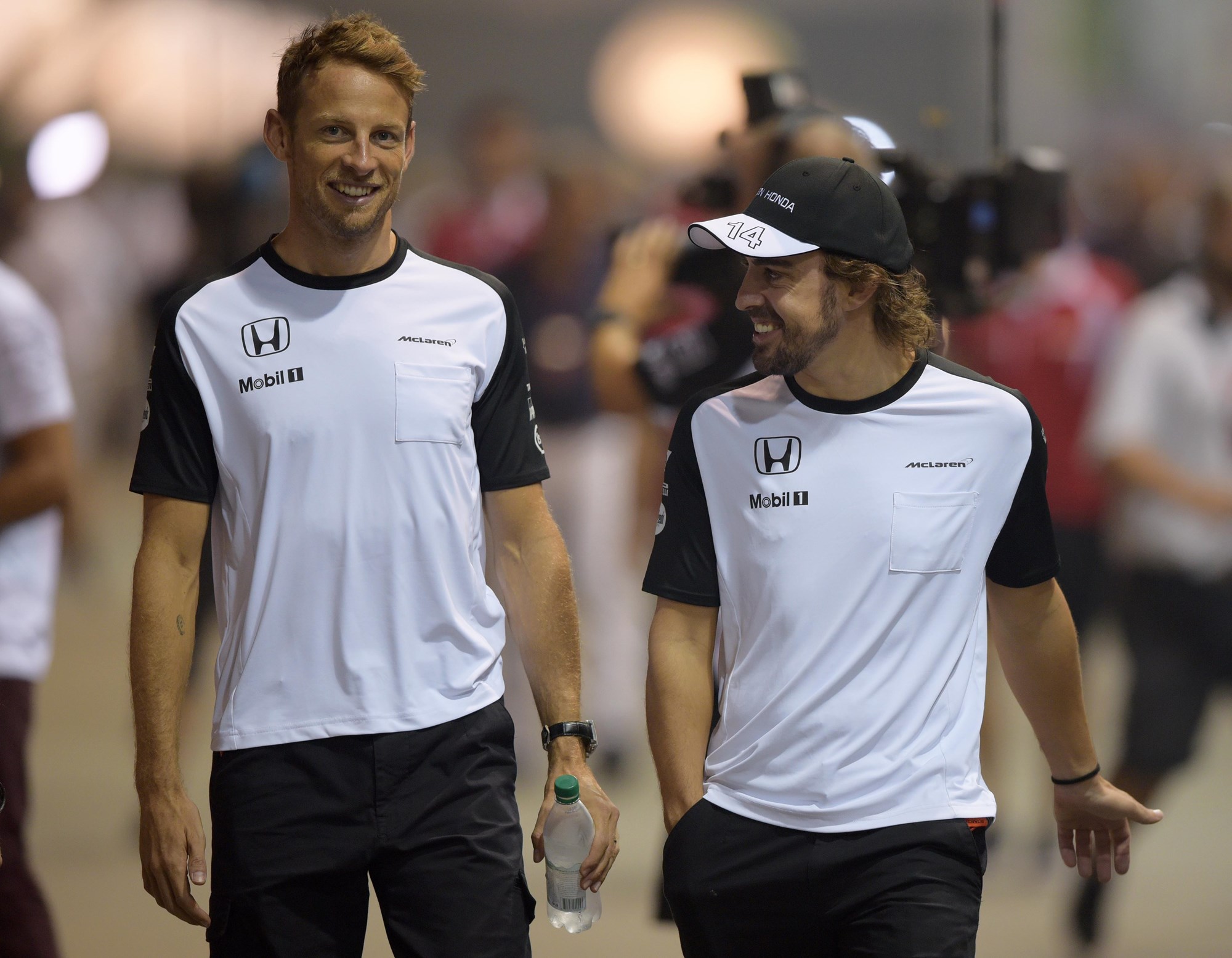 McLaren teammate's Jenson Button, left, of Britain and Fernando Alonso of Spain, joke as they walk to the drivers meeting following the second practice session at the Singapore Formula One Grand Prix earlier this month. Picture/AP.