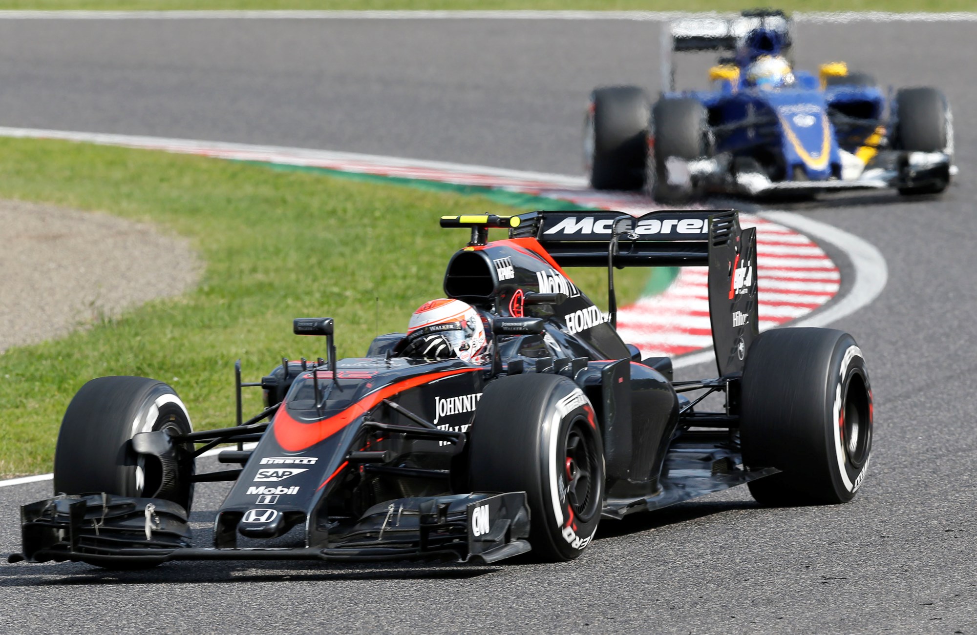 McLaren driver Jenson Button followed by Sauber driver Marcus Ericsson of Sweden during the Japanese Formula One Grand Prix at the Suzuka Circuit in Suzuka, Central Japan, at the weekend. Picture/AP.