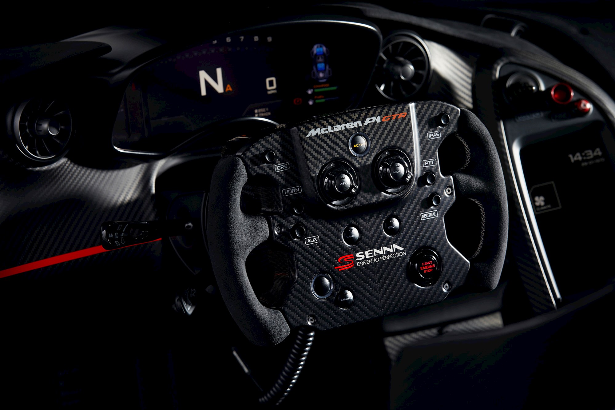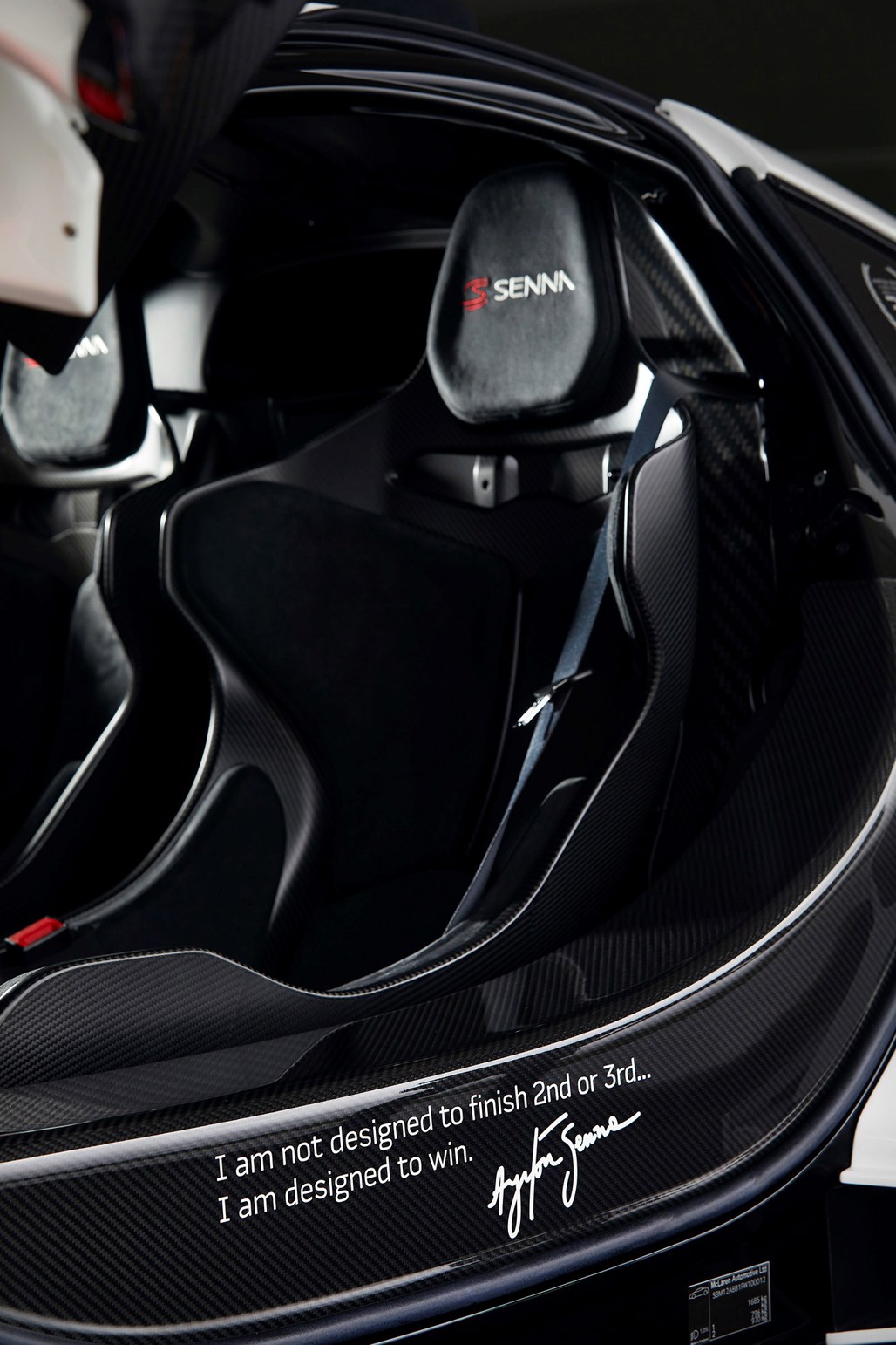 In the cabin Senna’s signature can be seen on the carbon fibre chassis sill accompanying one the owners favourite quotes. The steering wheel has been trimmed in Alcantara with stitching colour-matched to the ‘wheel of the MP4/4. Alcantara has also been used for the facia cover panel.