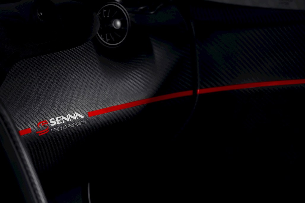 The core colours are the famous McLaren Rocket Red and Anniversary White that echo those of the Marlboro brand. Detailing includes the Senna Brand Trademark on the front splitter as well as in front of the air intake and each door, with the ‘Senna’ script and ‘Driven to Perfection’ slogan on the doors and intake.