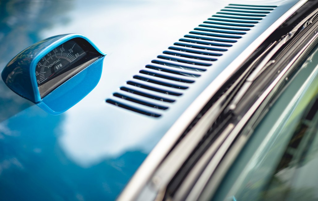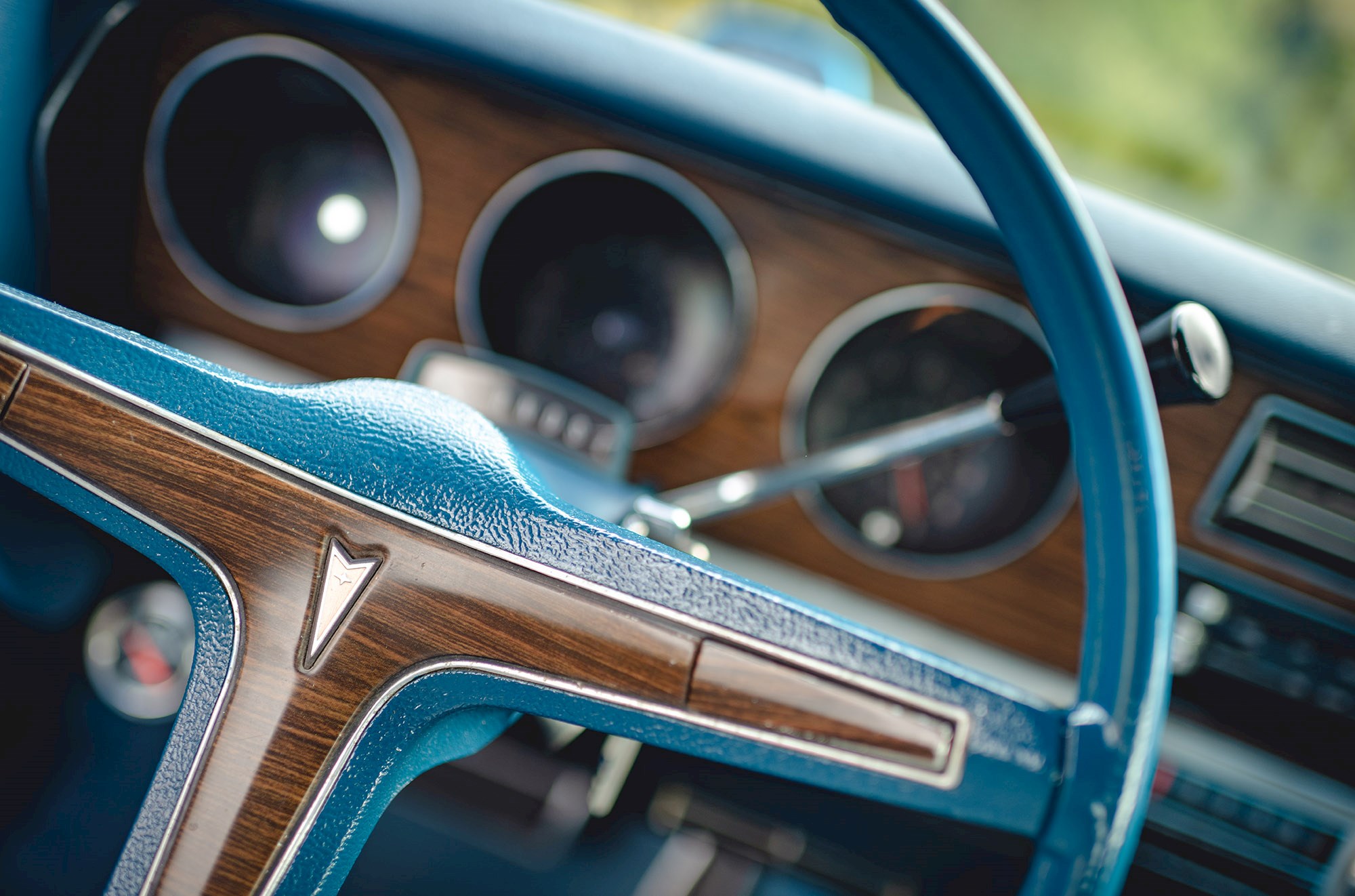 A 1972 Pontiac LeMans GT 400; engine, 400 ci; transmission, TH400 automatic. Its colour is Lucerne Blue, the interior is deluxe cloth and vinyl. The options are a hood tach, factory eight-track stereo, air conditioning, tinted glass and a rear “surfboard” spoiler. It still has its original spare tyre from 1972.