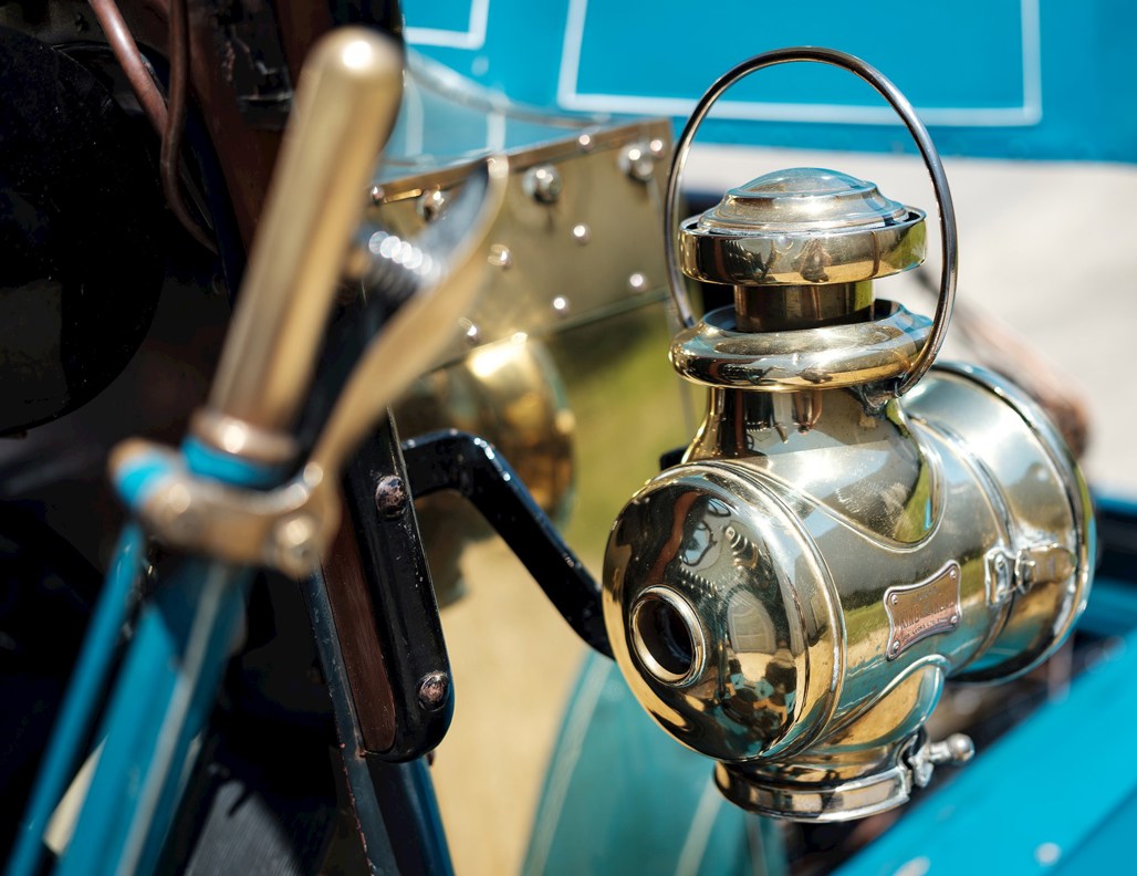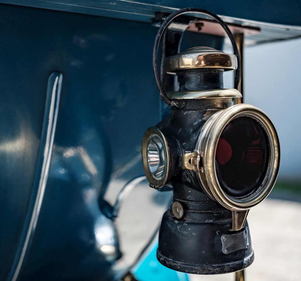 It is crank-started and the petrol has to be primed — hand-pumped from the main petrol tank to an ancillary tank in front of the steering wheel. It then siphons down into the carburettor. Pressure has to be kept up, so hand pumping has to continue all the time it is travelling. Hence a second person is needed alongside the driver to operate the hand pump under the front seat.
