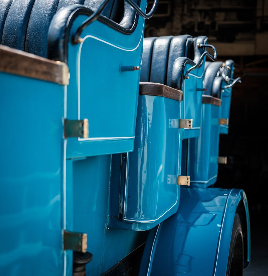 It has a four-cylinder water-cooled side valve engine, capacity 3563cc, and 20hp. The non-synchromesh gear box, which is controlled from a lever outside the vehicle, is driven through a cone clutch and has four forward and one reverse gear. The handbrake hand operates on the two back wheels. The charabanc has solid rubber tyres. Lighting is by acetylene gas.