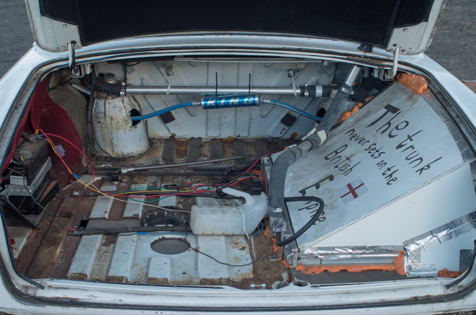 Let's talk about the radiator, for example. Contrary to where you'd normally expect it to be, it now sits in the boot. It gulps air from two homemade vents grafted onto the rear fenders.