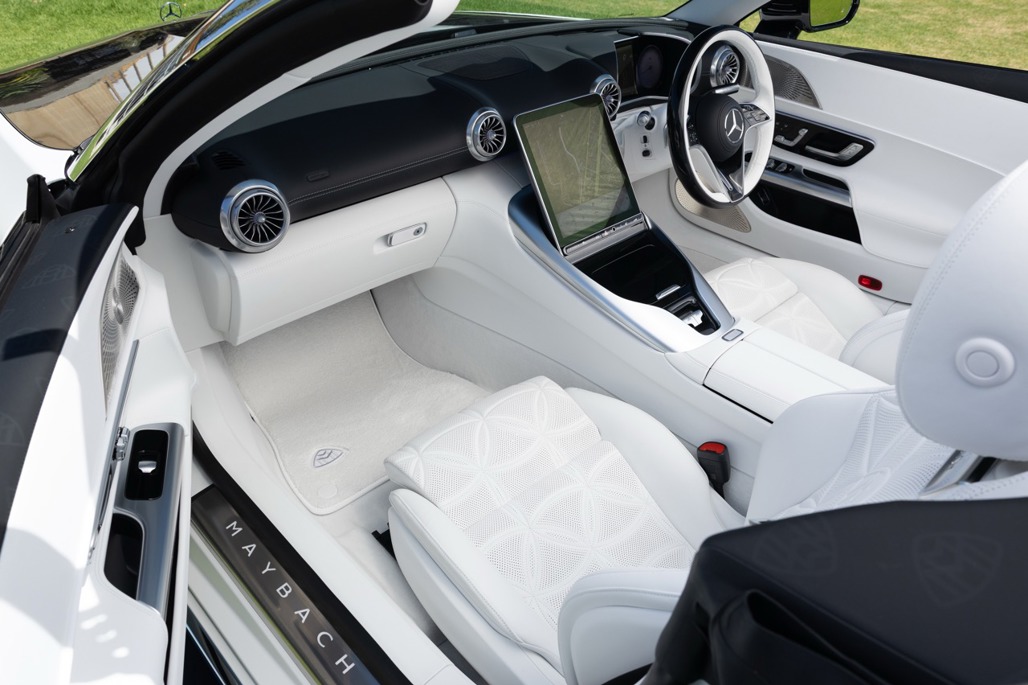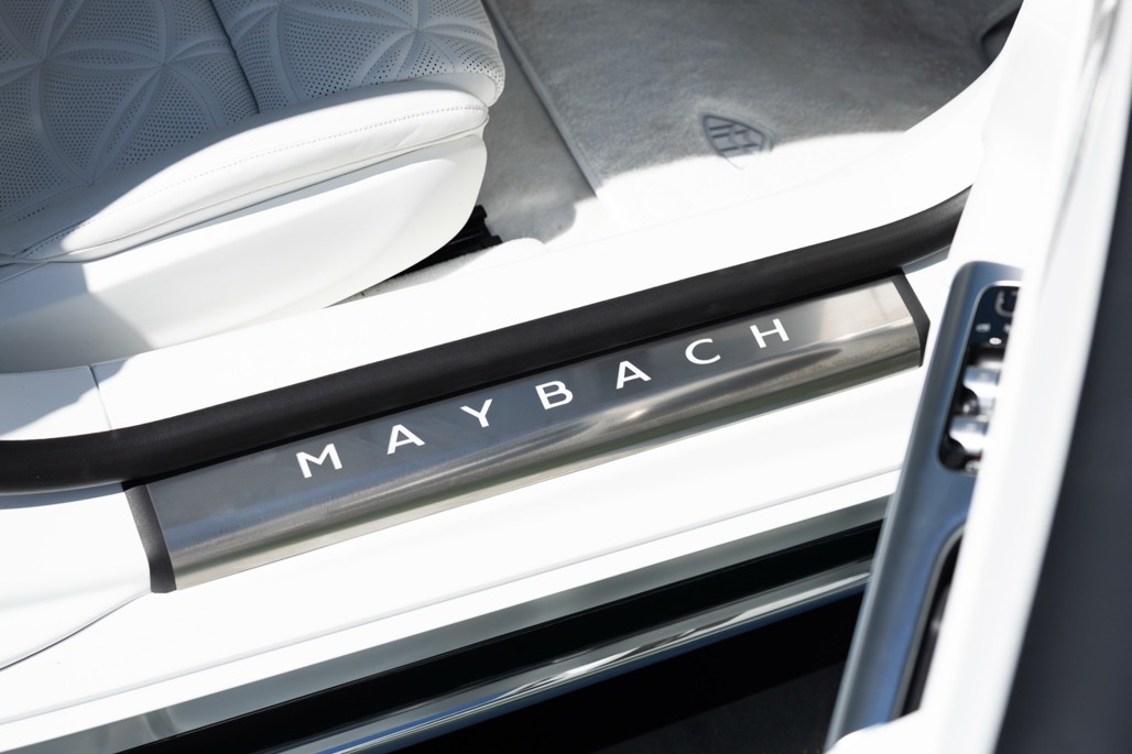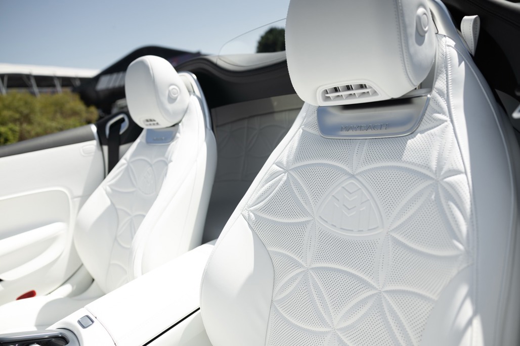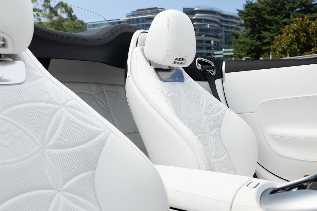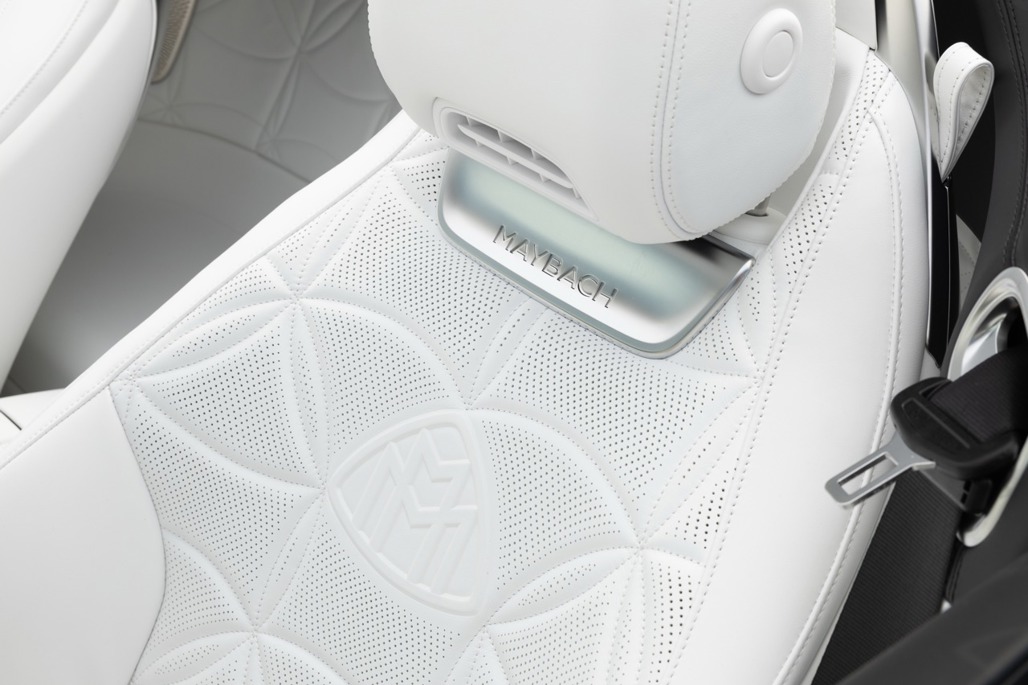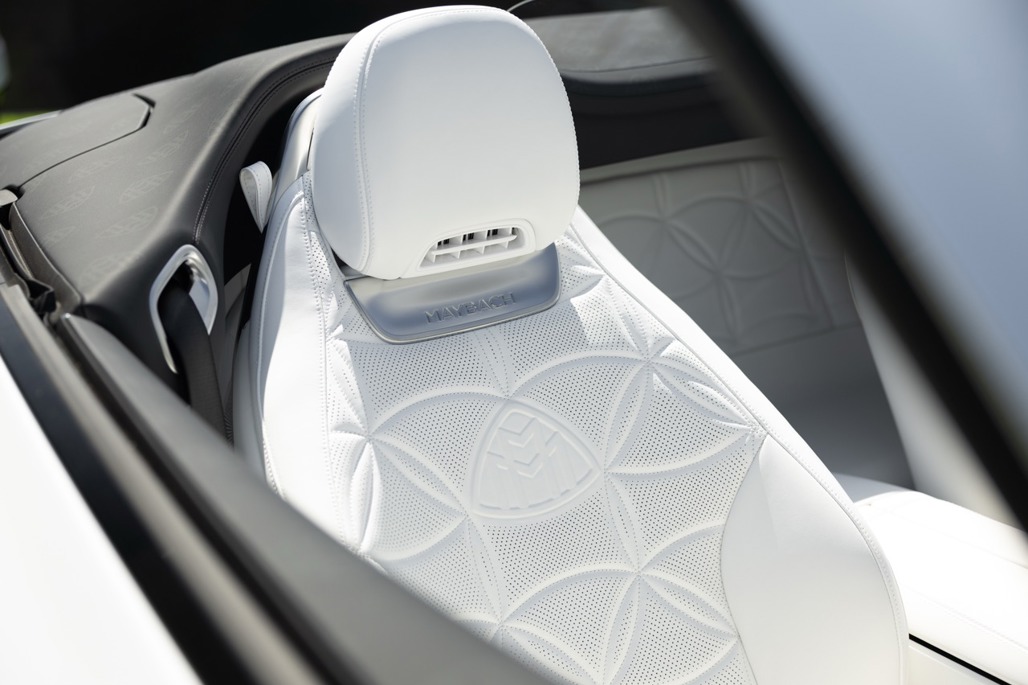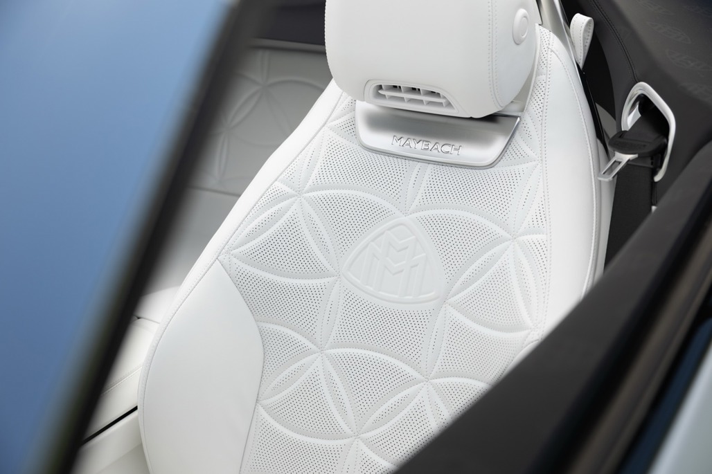 Inside, Nappa leather meets a Dinamica microfibre roof liner, with seats featuring embossed Maybach emblems and a floral upholstery layout that feels deliberate rather than decorative.