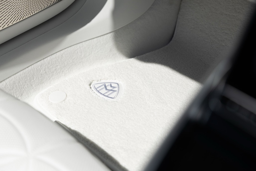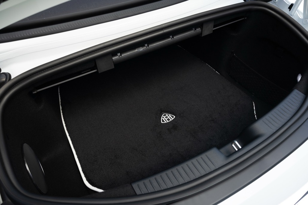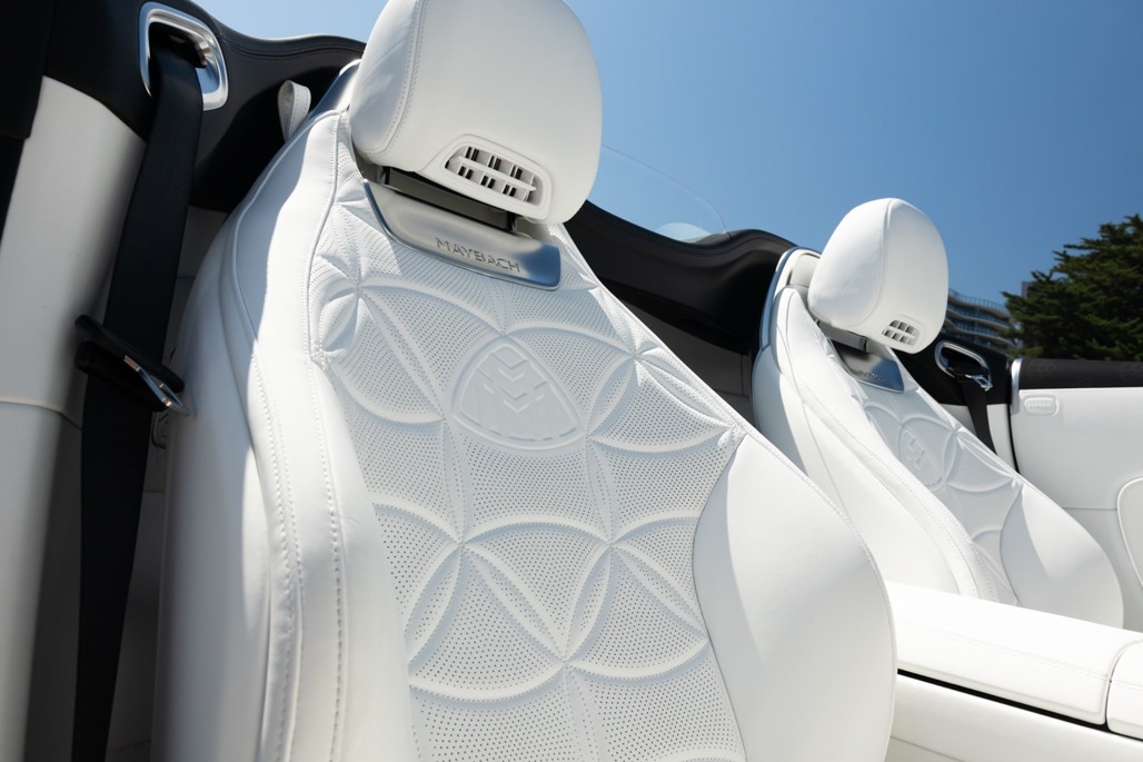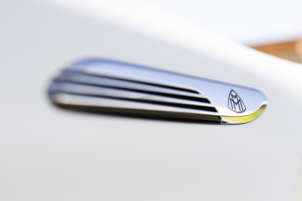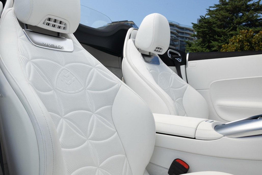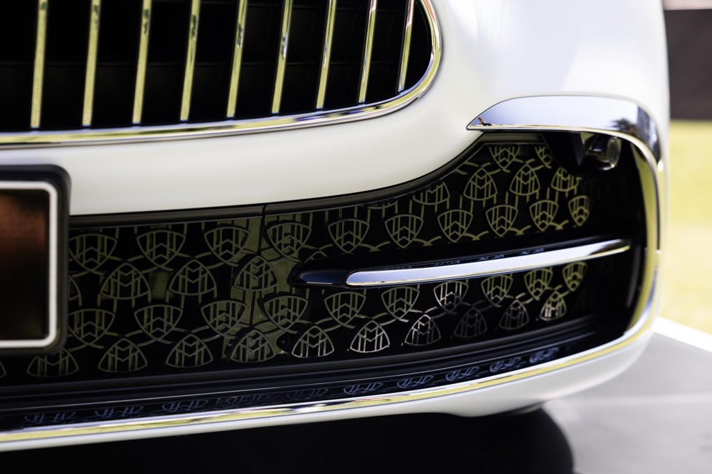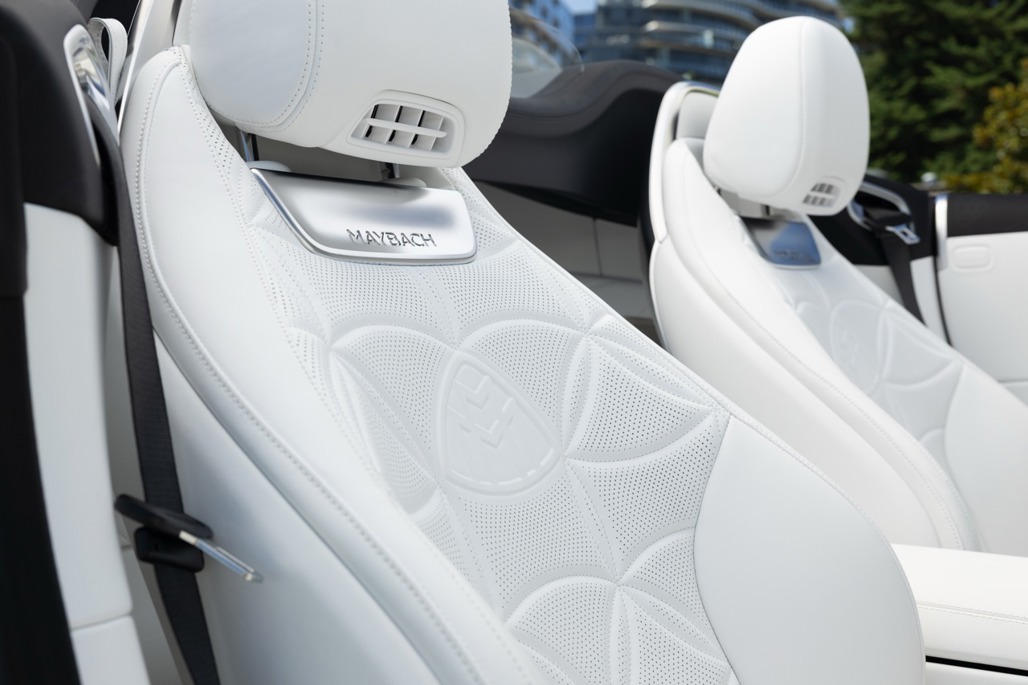 Inside, Nappa leather meets a Dinamica microfibre roof liner, with seats featuring embossed Maybach emblems and a floral upholstery layout that feels deliberate rather than decorative.