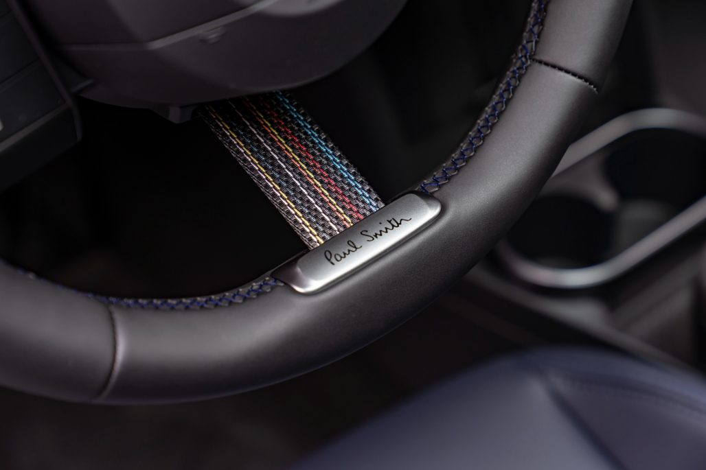 Knitted black surfaces on the dashboard and door panels are inspired by Paul Smith’s tone-on-tone stripe patterns and fabrics, while Nightshade Blue sports seats in Vescin feature knitted textile inserts on the shoulder and headrests. Decorative stitching on the steering wheel adds a pop of bright colour, in the Paul Smith style.