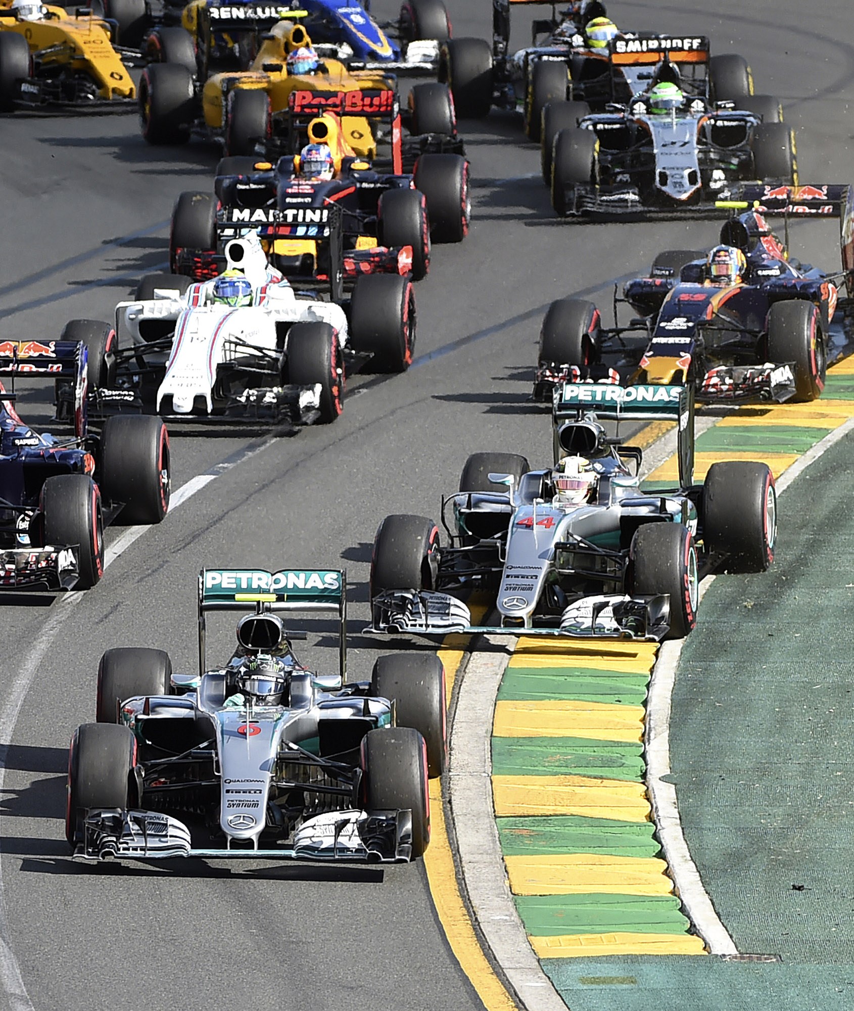 Mercedes driver Nico Rosberg (6) of Germany leafs teammate Lewis Hamlilton (44) of Britain through the first turn during the Australian Formula One Grand Prix yesterday. Picture/AP.
