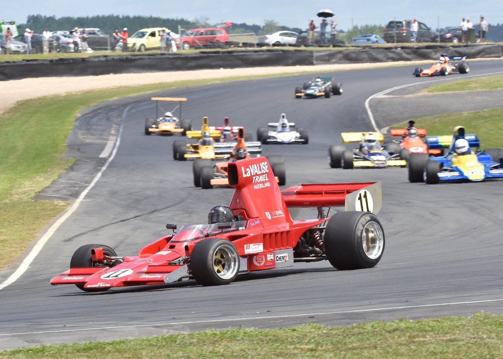 The action took place behind Smith with Aucklanders Alan Dunkley (Lola T332) and David Banks (Talon MR1) battling for the podium places. In the 12-lap feature race, Rotorua’s Brett Willis (Lola T330) joined the battle with a forceful drive.