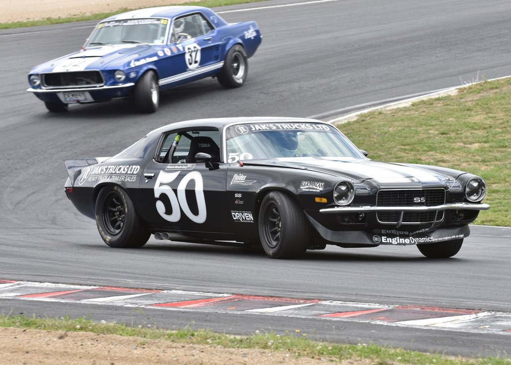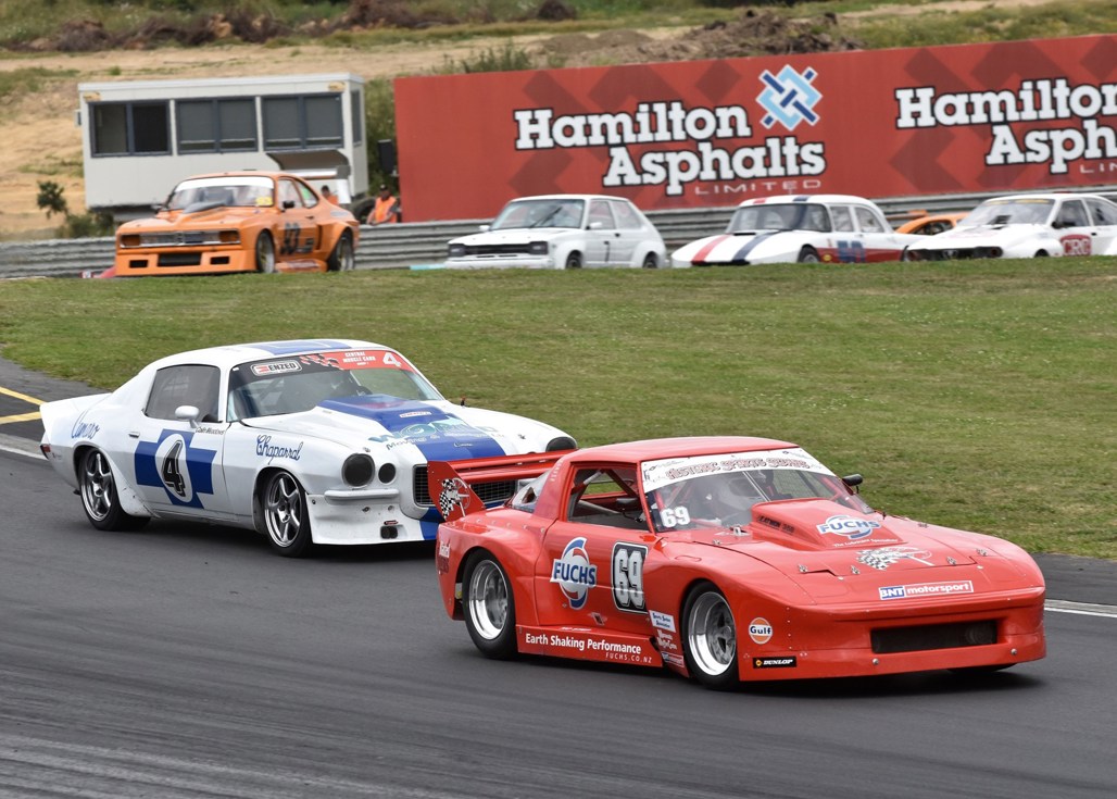 Howard Wood’s rapid BMW Alpina 2002 Tii snapped at the heels of the V8s, a reverse top-10 start for the final race gave Wood an early break and the 2.0-litre machine stayed in front, chased by the 6.2-litre 1967 Camaro of Papamoa’s Kevin Gimblett.