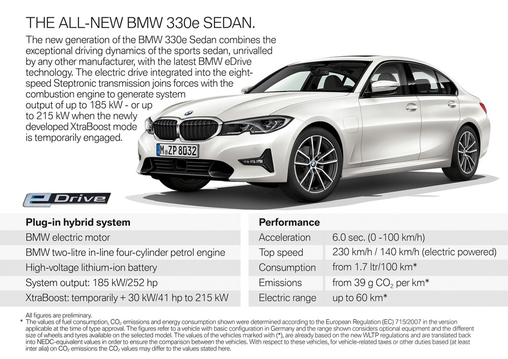 The 330e's power train features a turbocharged 2.0-litre 4-cylinder engine with an output of 135kW and an electric motor generating a continuous output of 50kW.